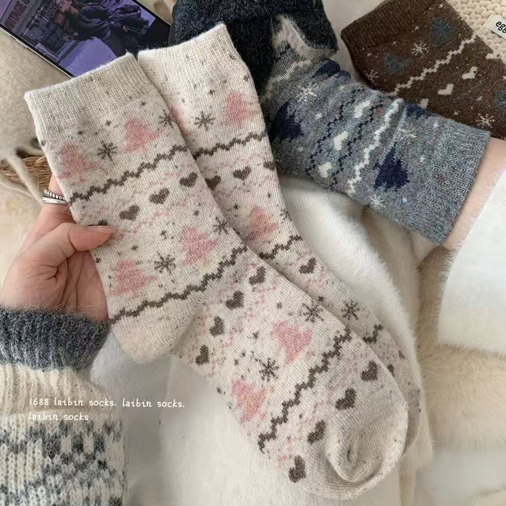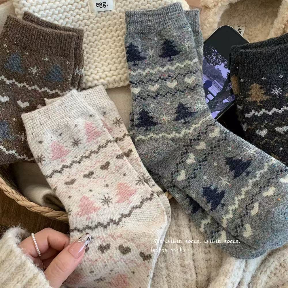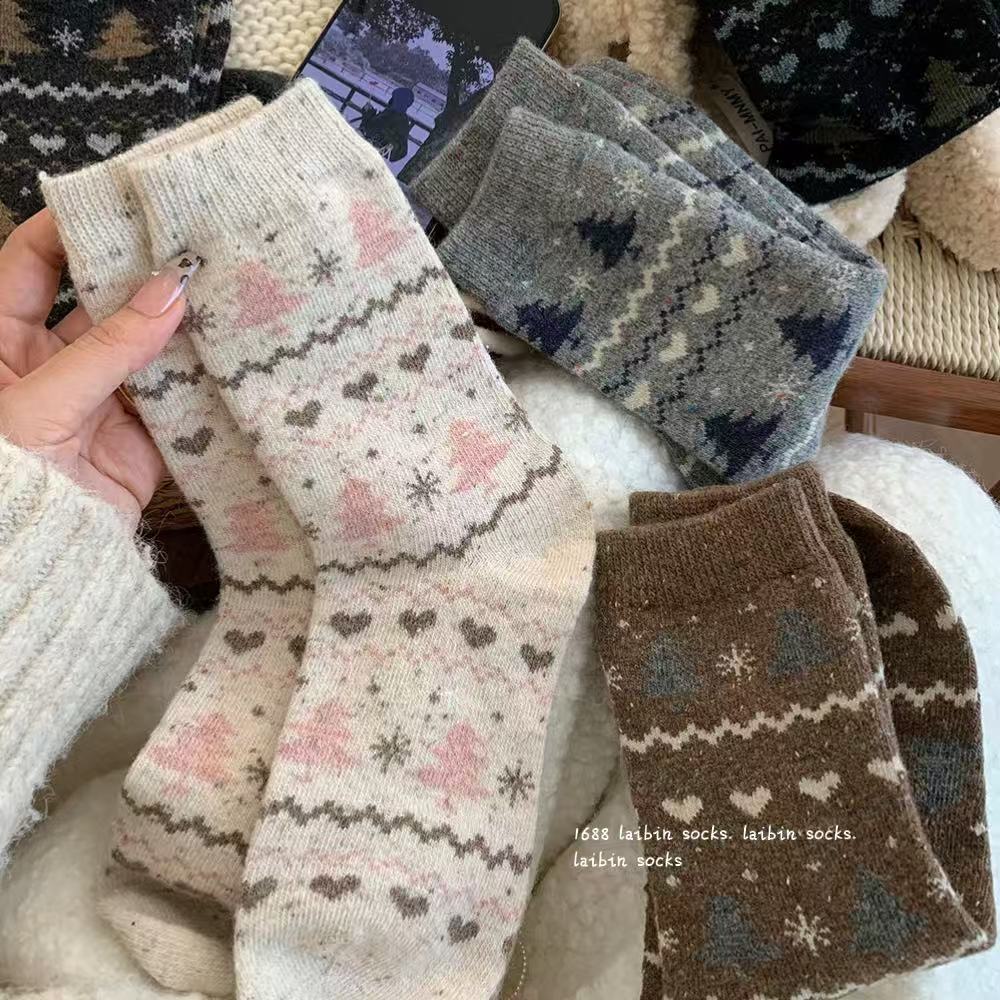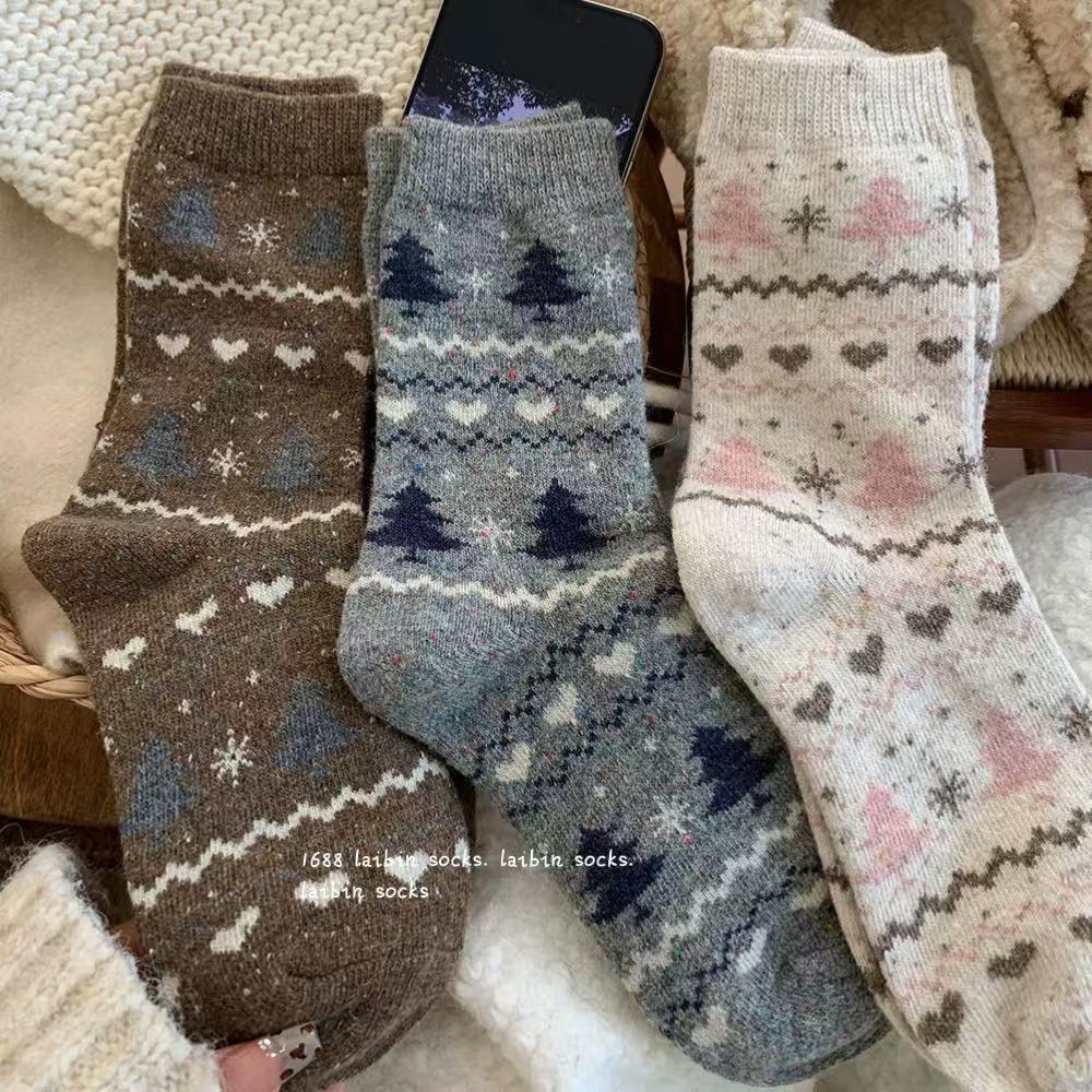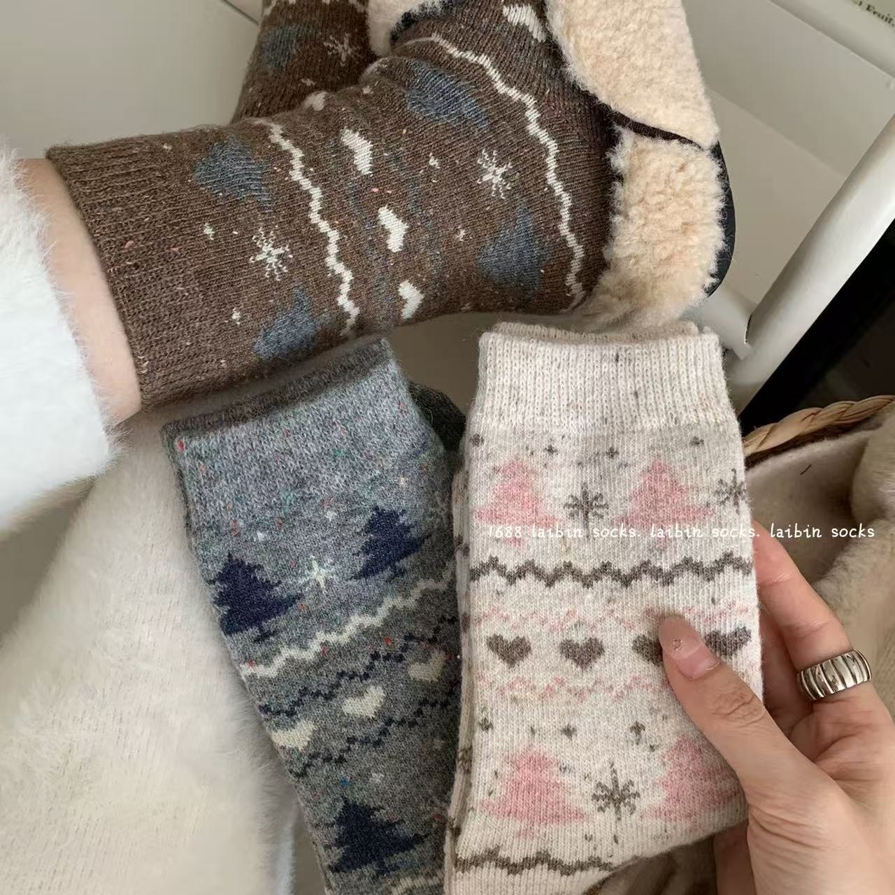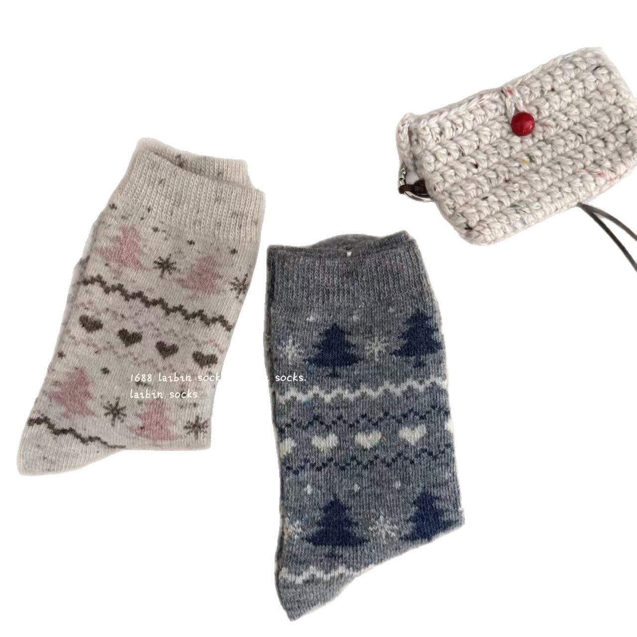 保暖袜子女费尔岛羊毛复古点子纱秋冬季袜子女中筒袜圣诞树厚袜子