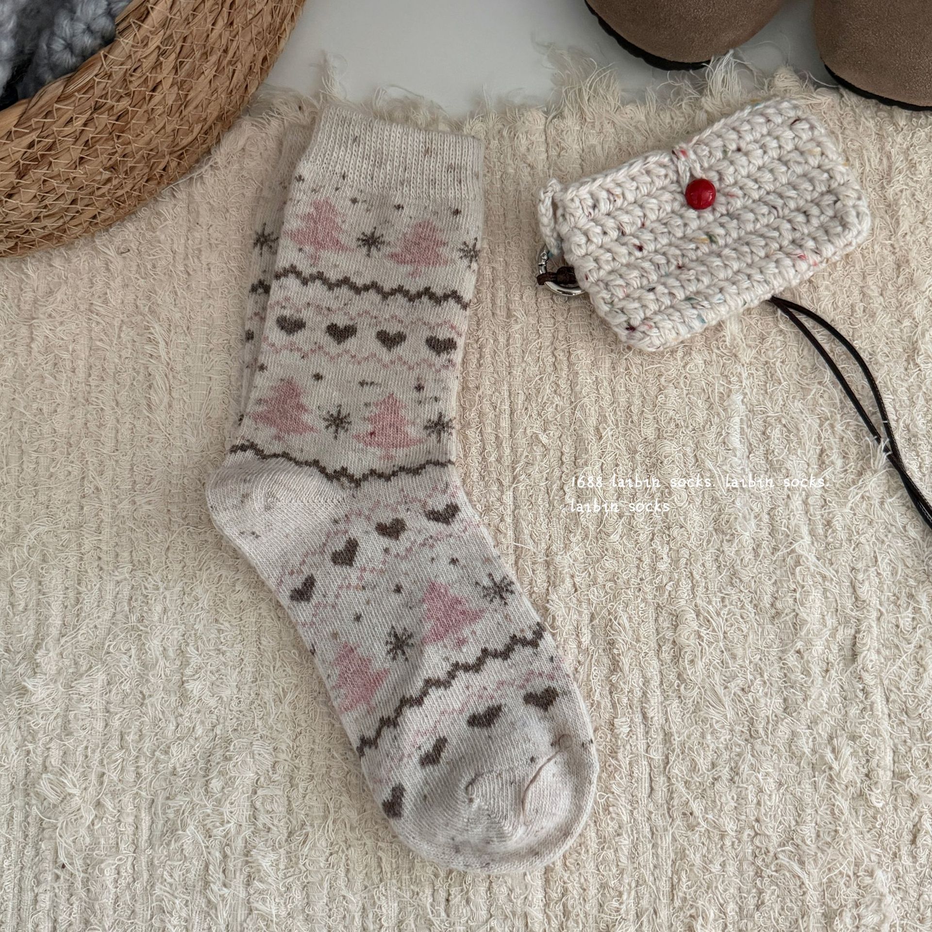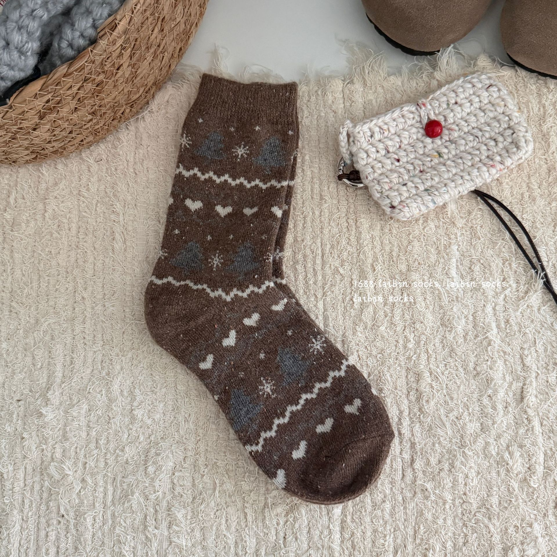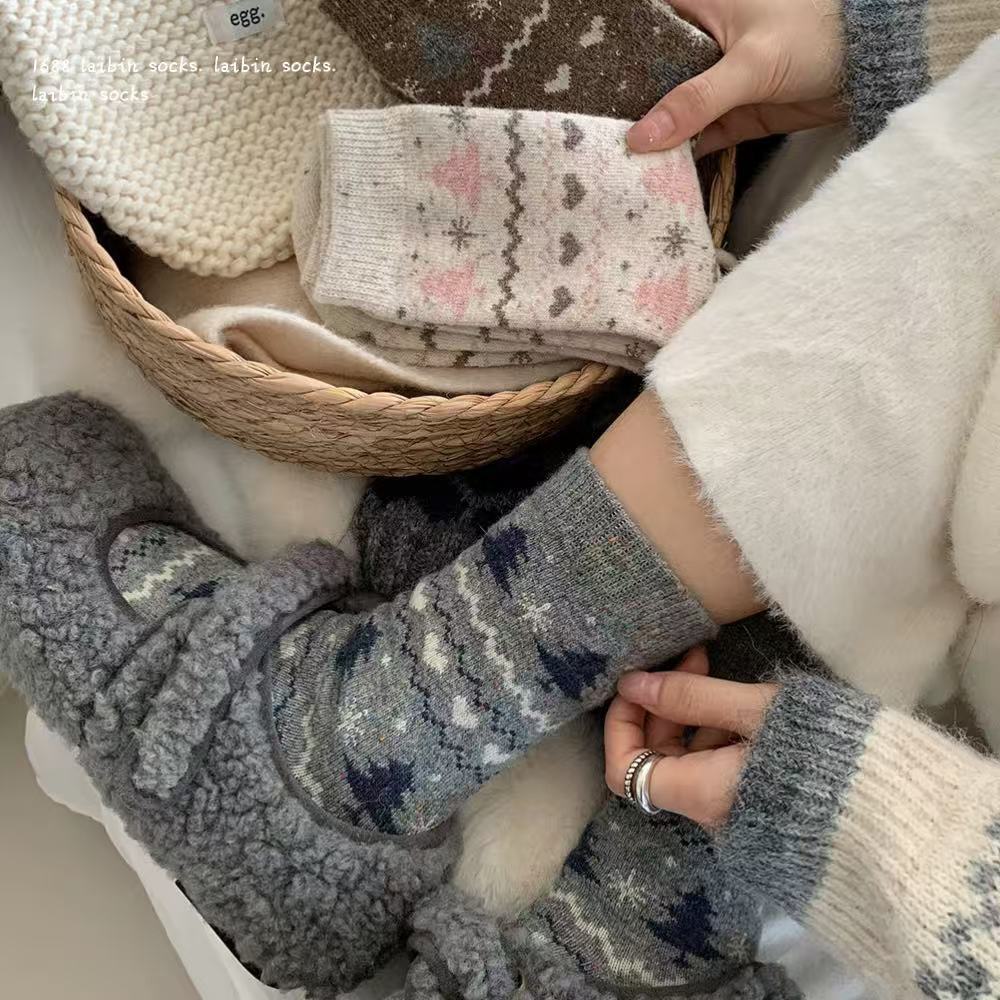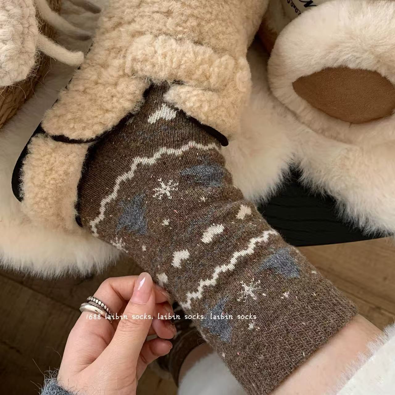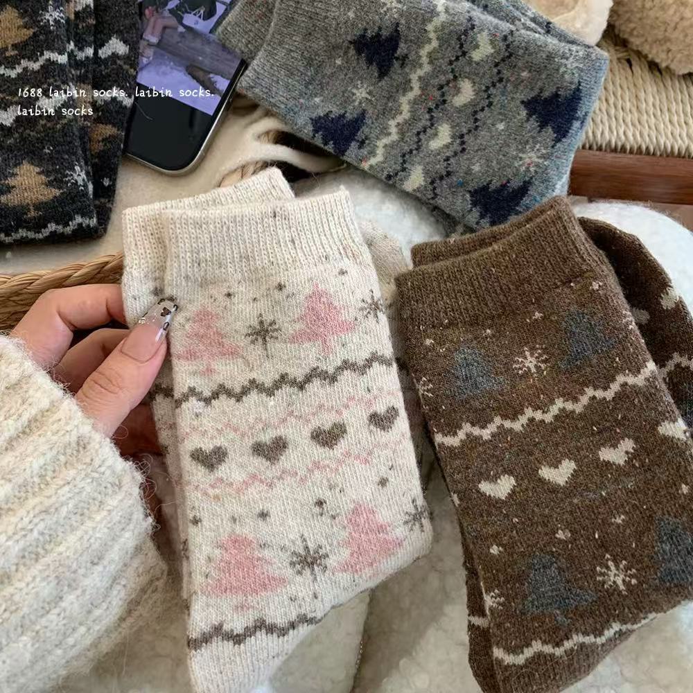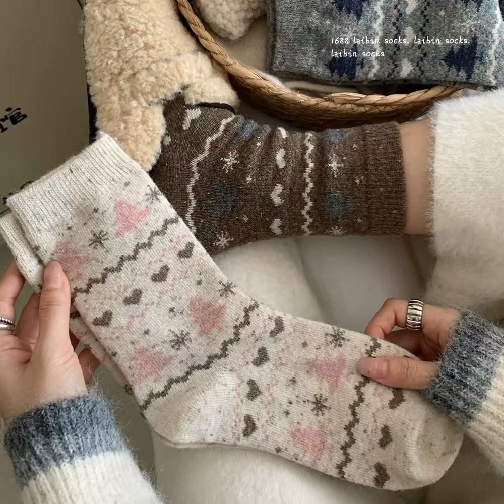 保暖袜子女费尔岛羊毛复古点子纱秋冬季袜子女中筒袜圣诞树厚袜子