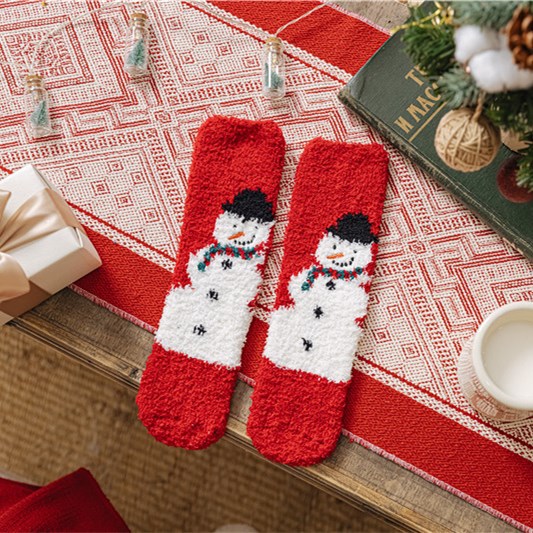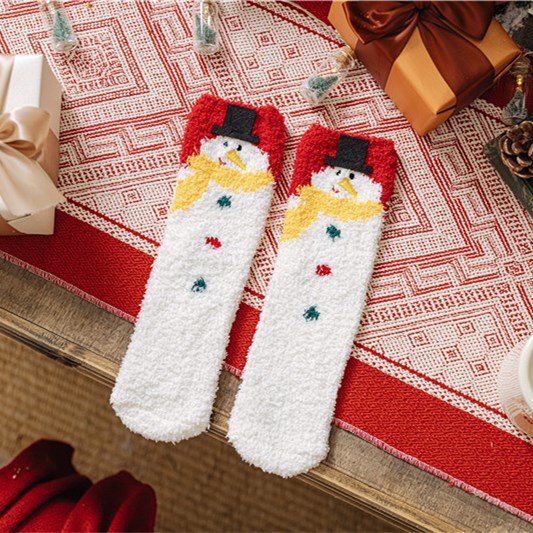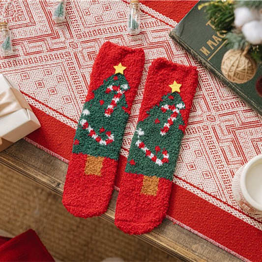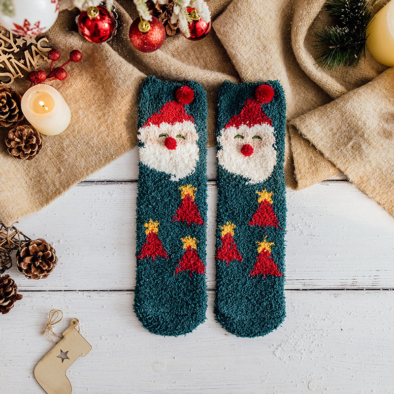 圣诞节袜子女不掉毛珊瑚绒袜加厚保暖圣诞睡眠袜卡通半边绒地板袜
