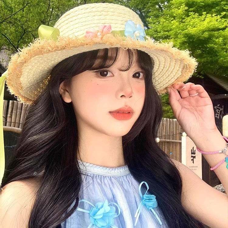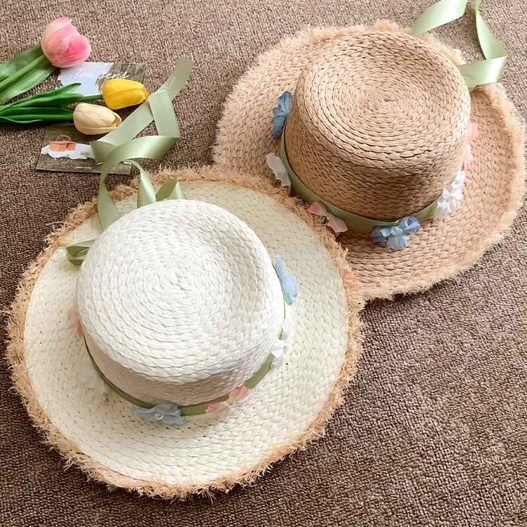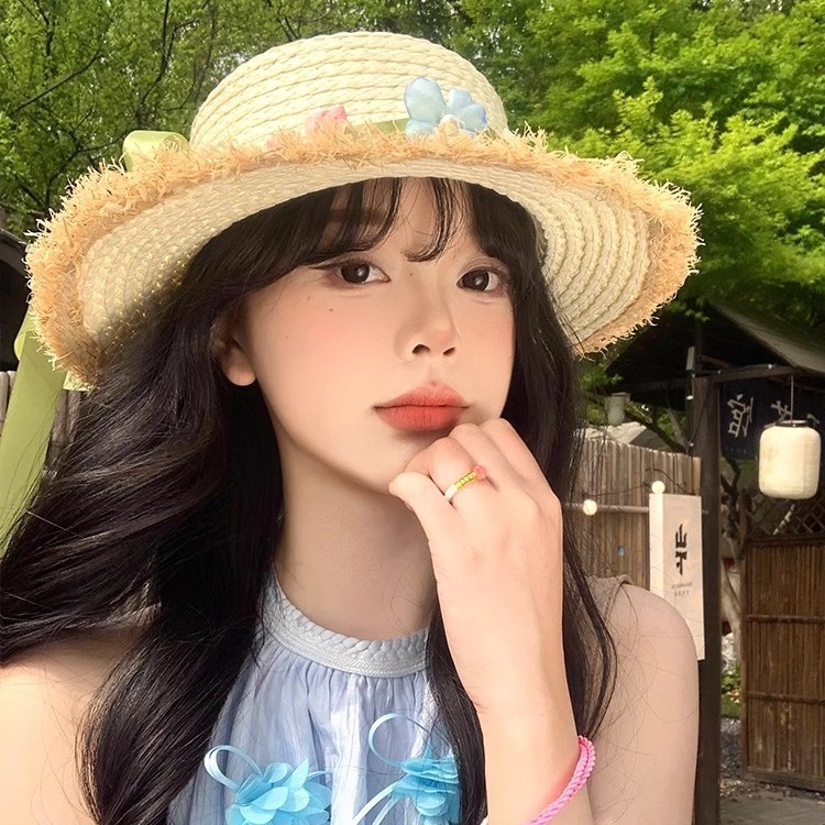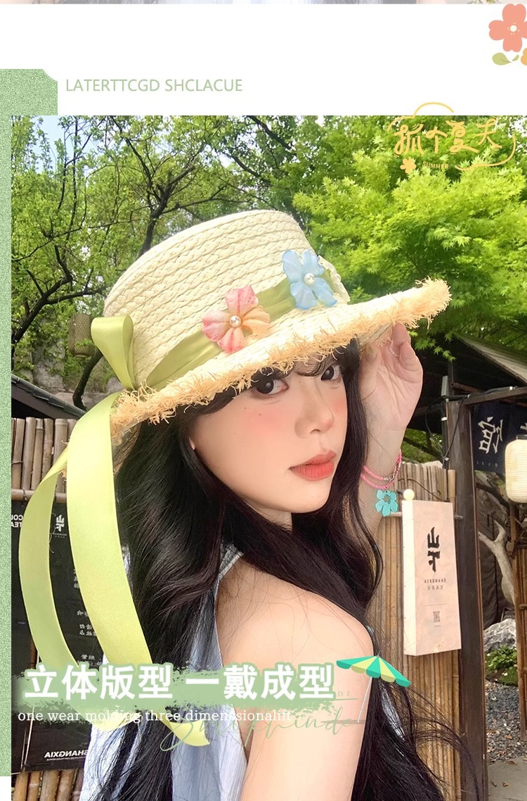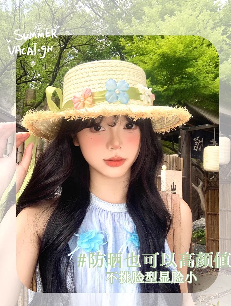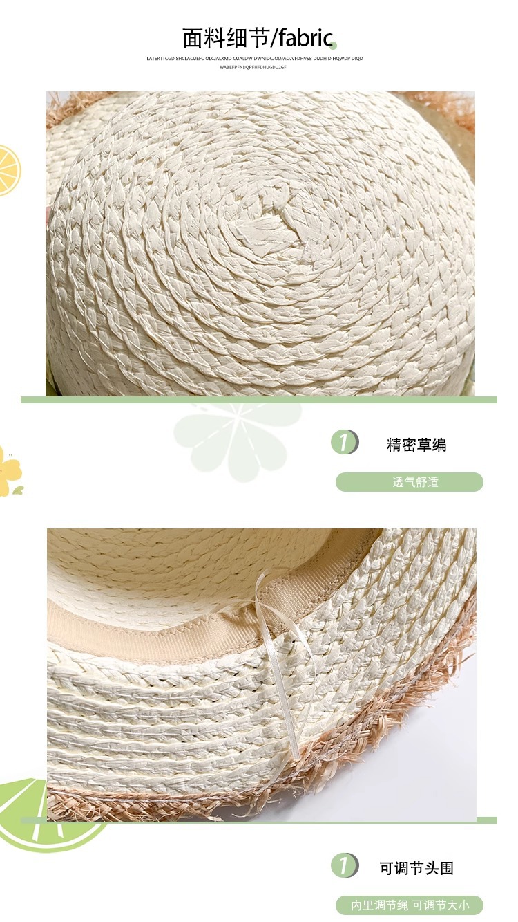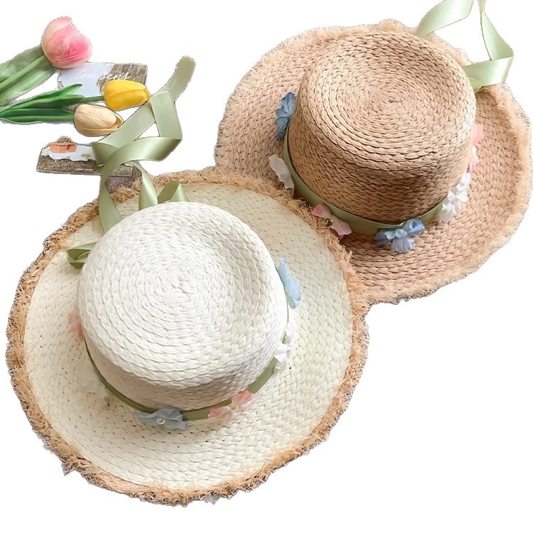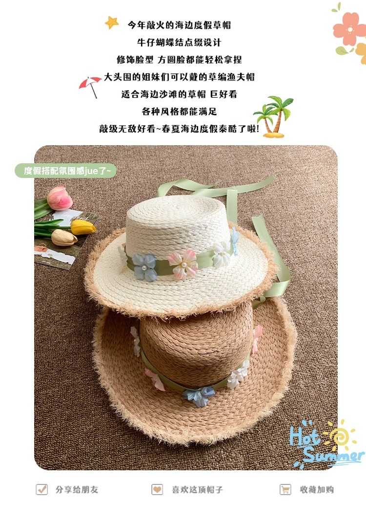 蝴蝶结花朵平顶拉菲草帽女夏季海边沙滩度假风太阳帽子防晒遮阳帽