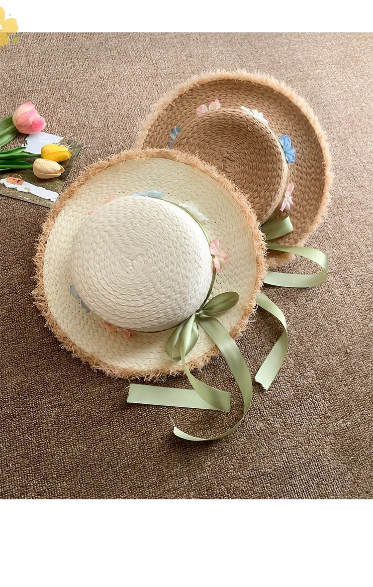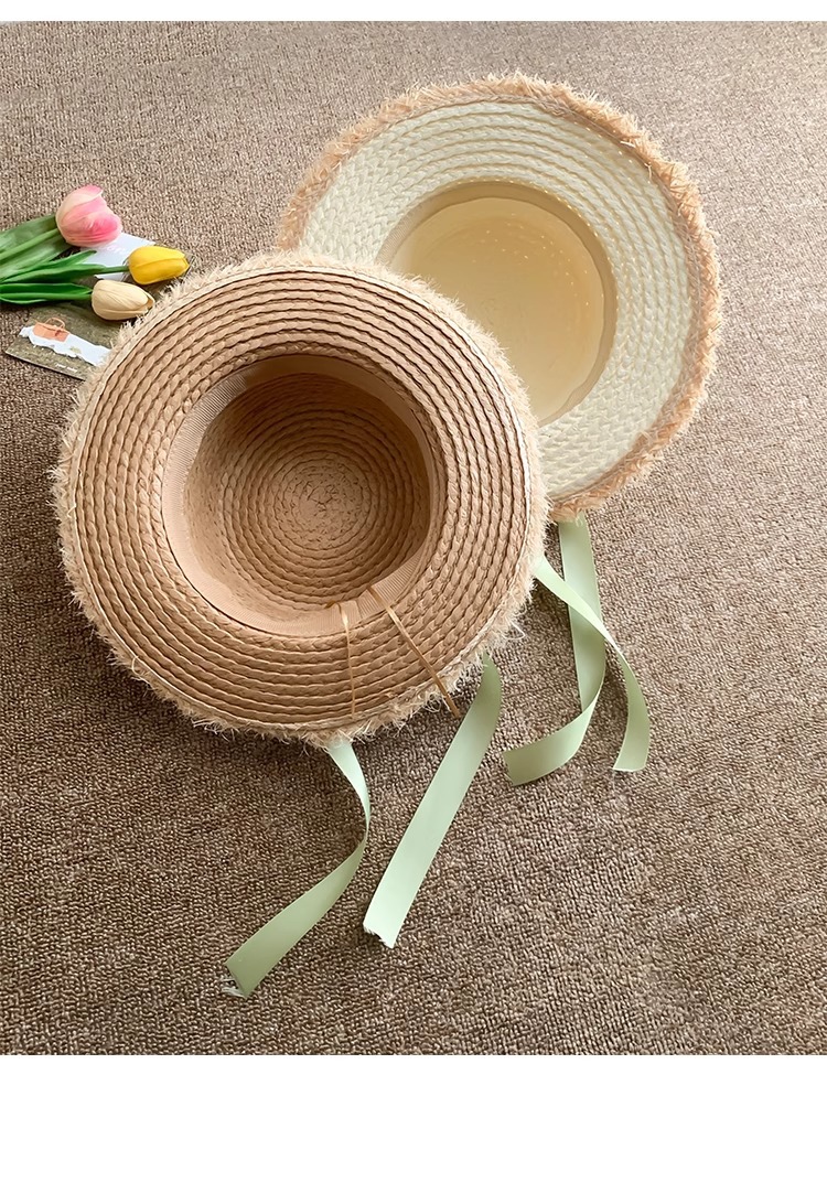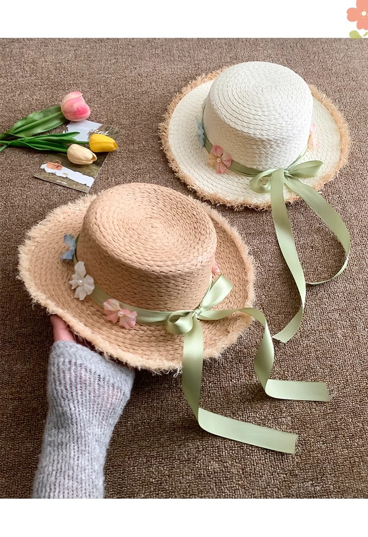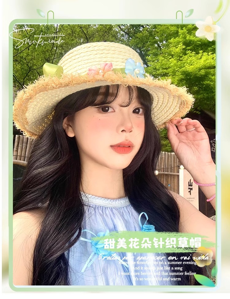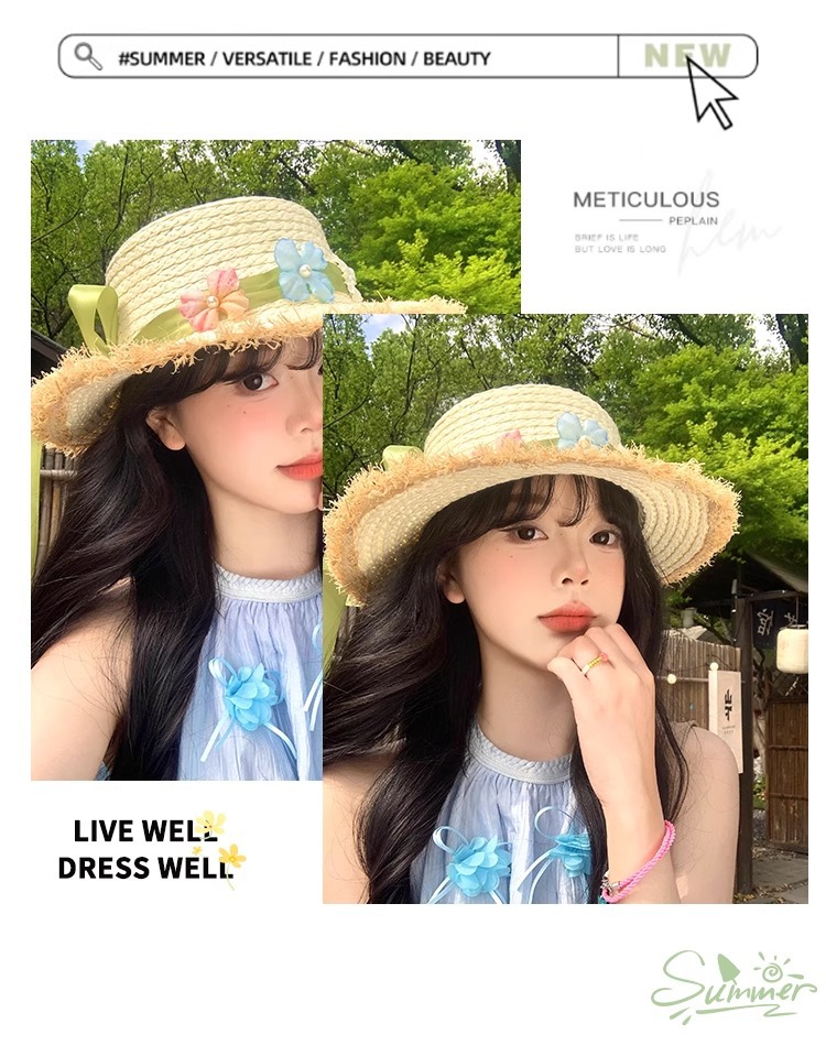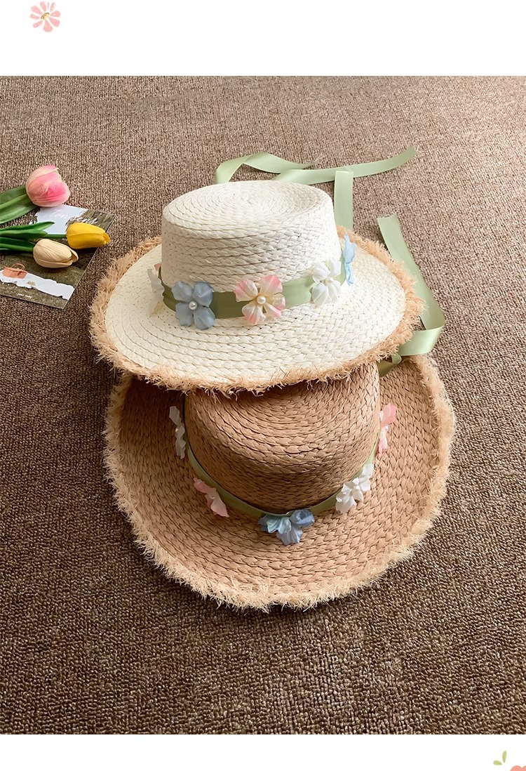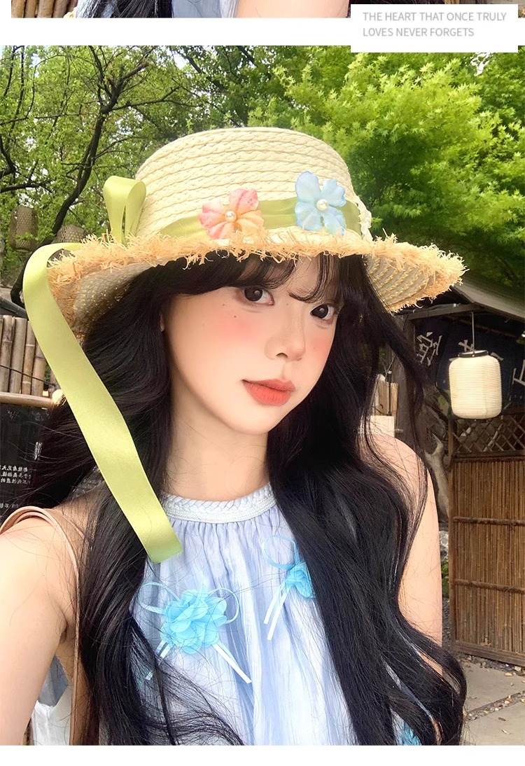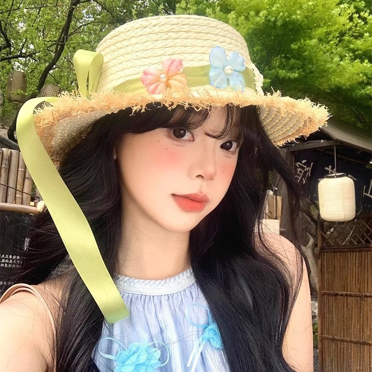 蝴蝶结花朵平顶拉菲草帽女夏季海边沙滩度假风太阳帽子防晒遮阳帽