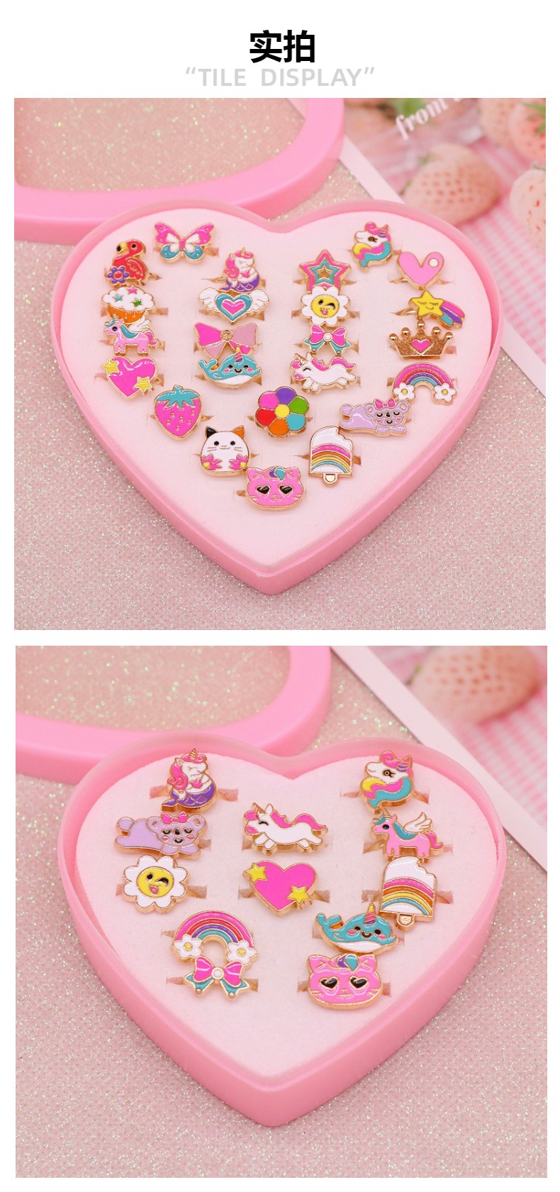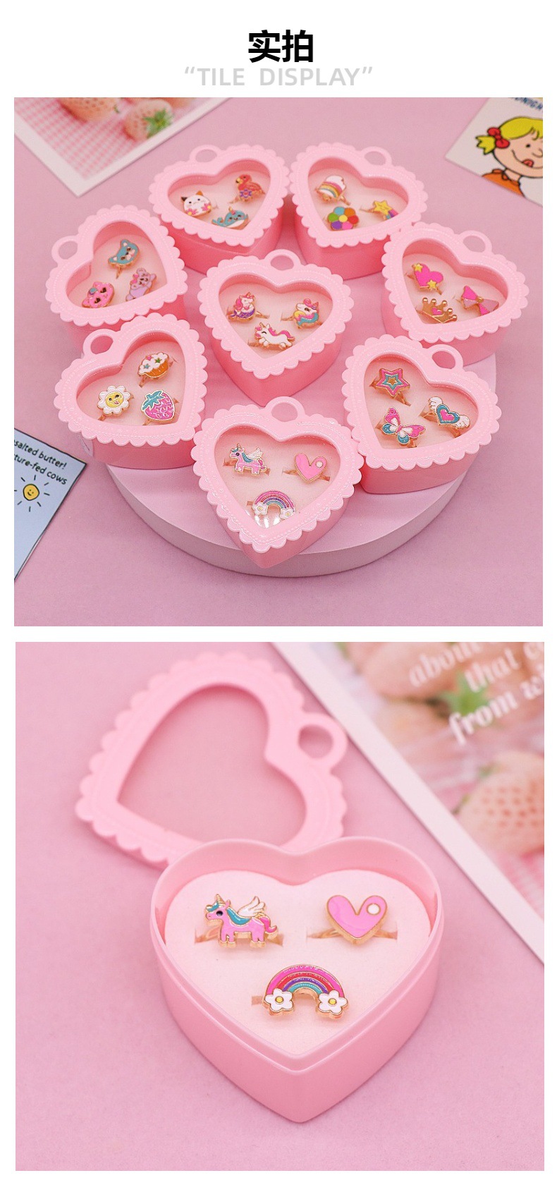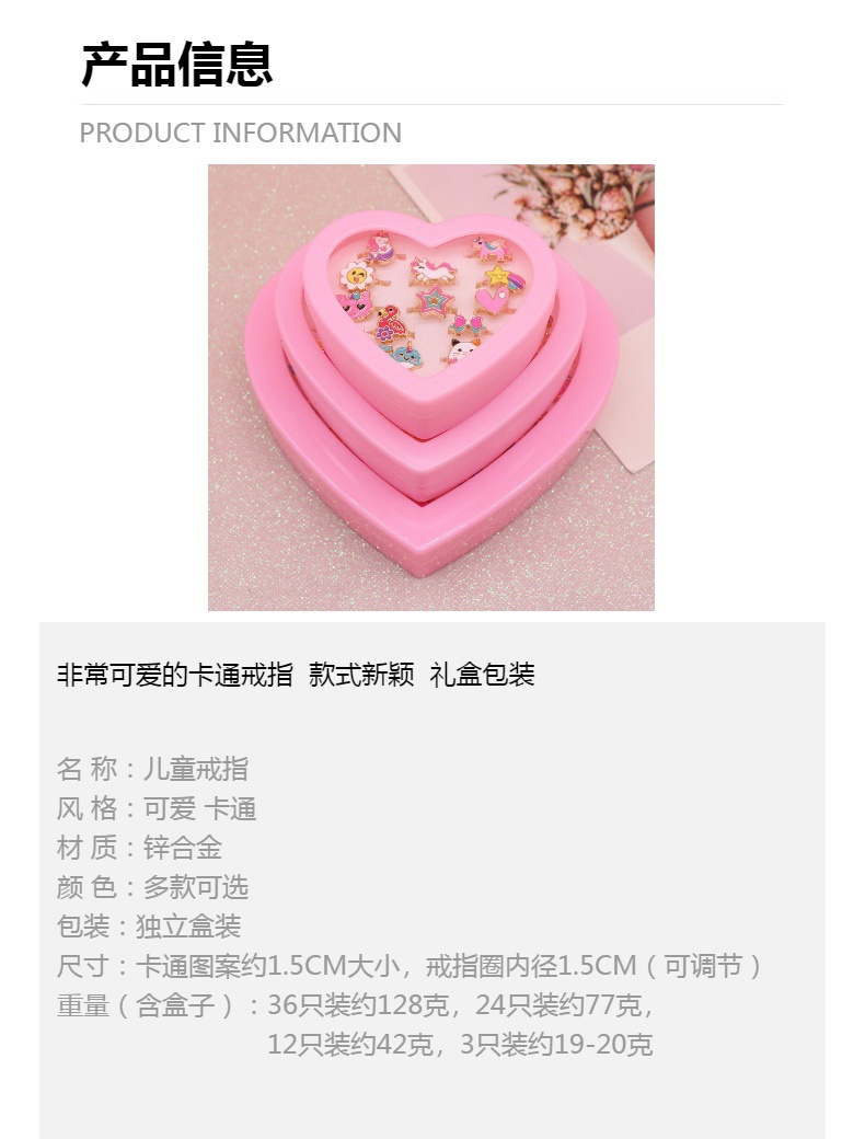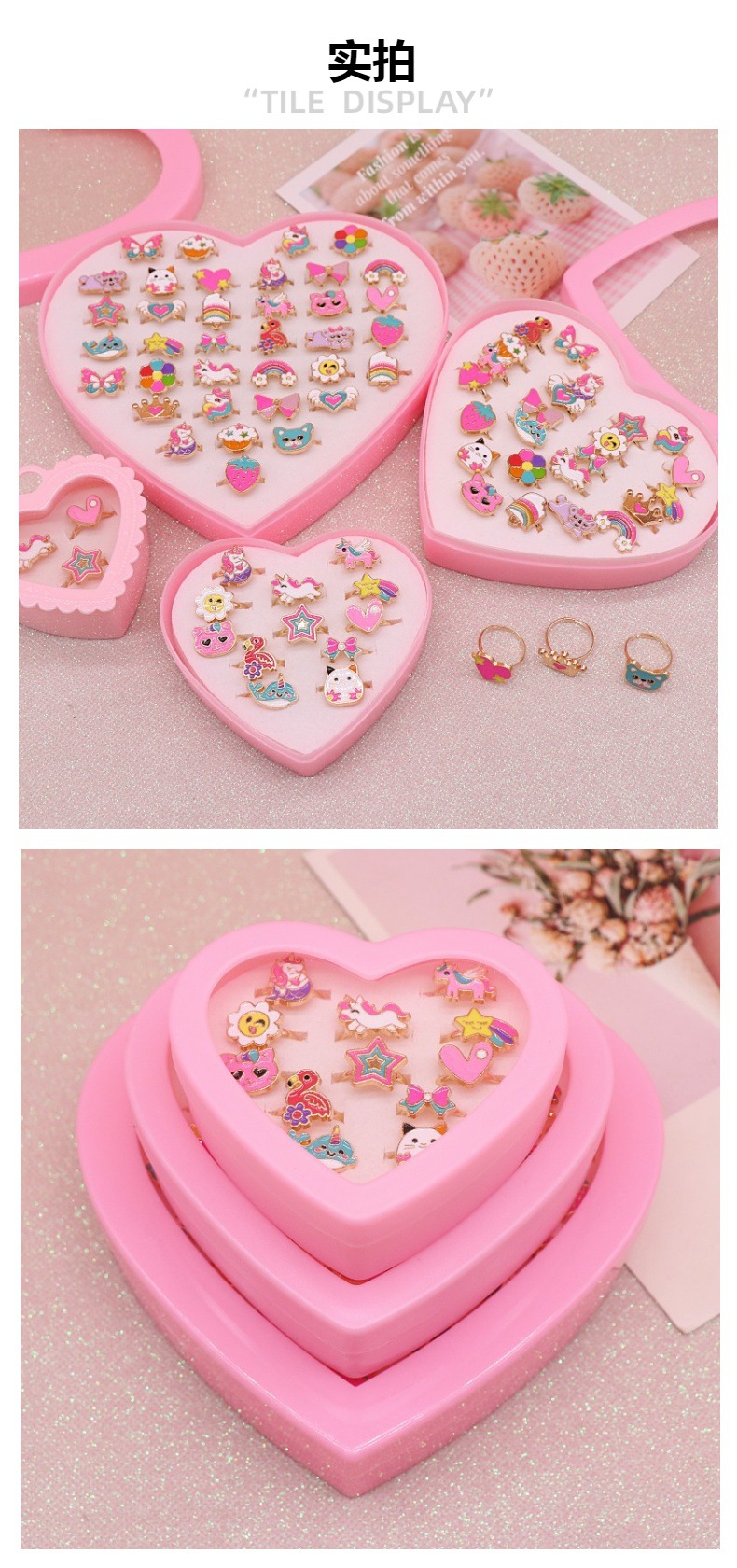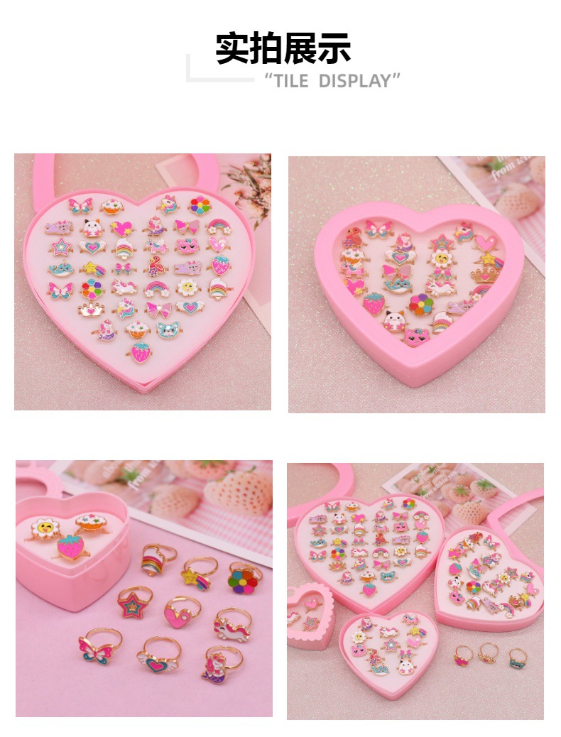 新款儿童戒指套装合金女生精美指环可调节爱心盒套36枚卡通混款