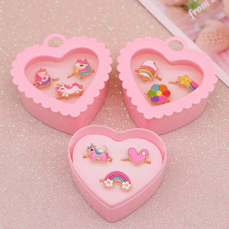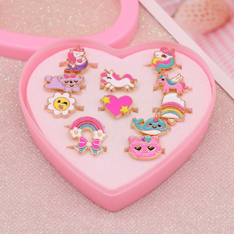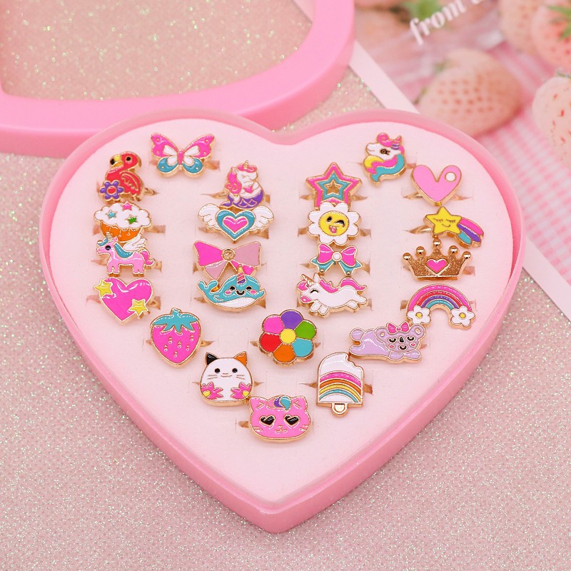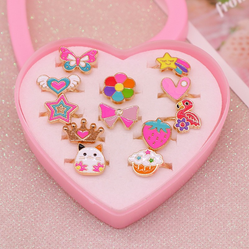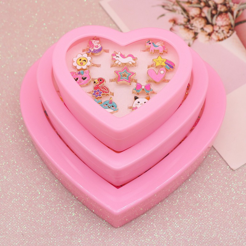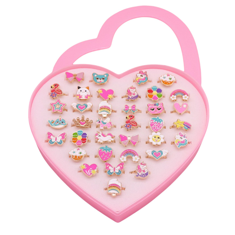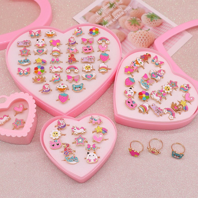 新款儿童戒指套装合金女生精美指环可调节爱心盒套36枚卡通混款