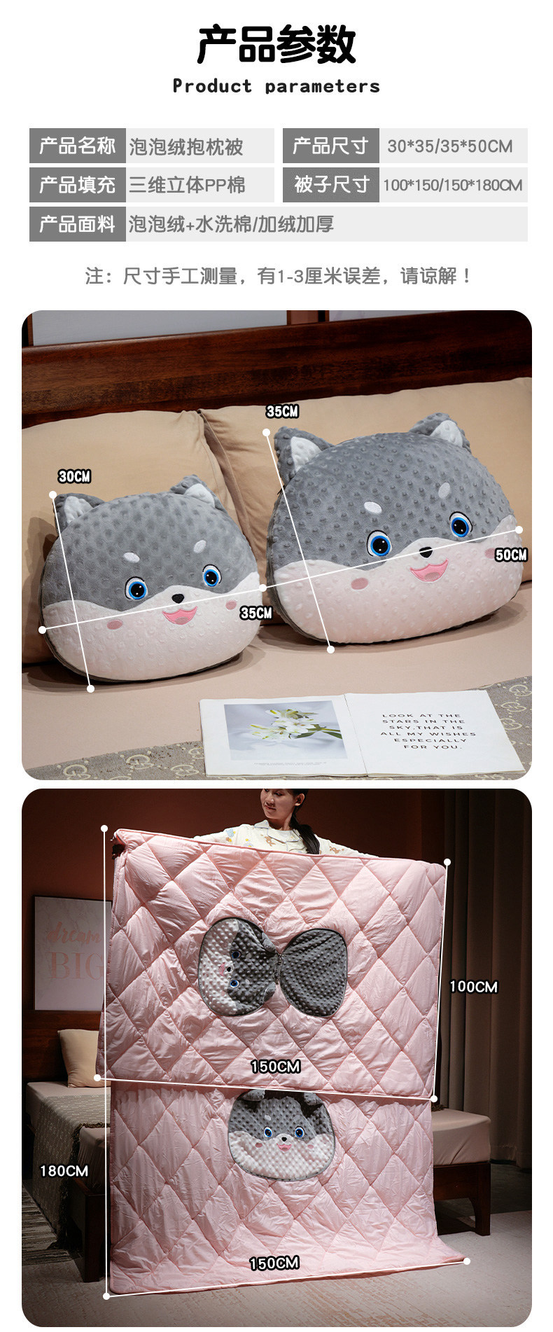 泡泡绒大号抱枕50*35cm,展开1.5*1.8米(内加绒加厚被)