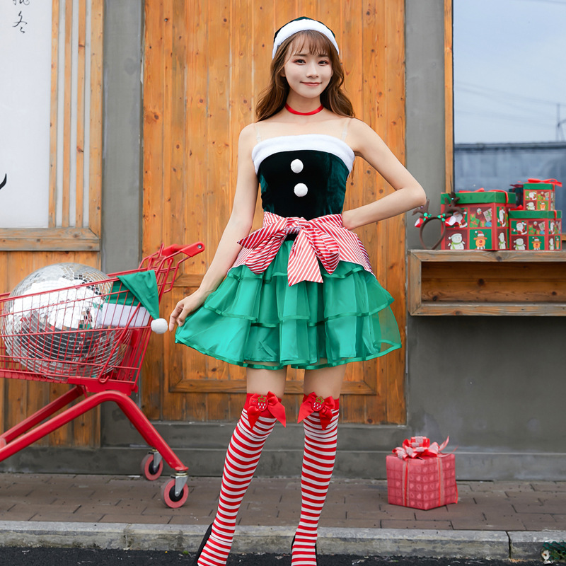 圣诞节cosplay服装平安夜可爱墨绿色圣诞精灵蓬蓬蛋糕抹胸连衣裙
