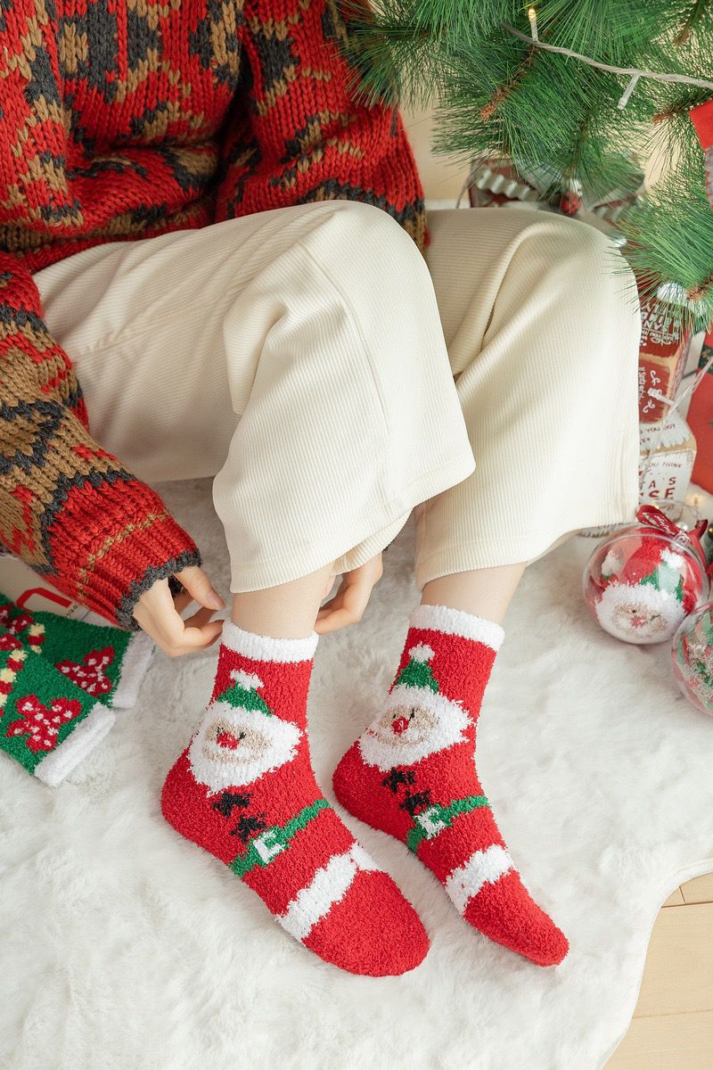 珊瑚绒圣诞袜子居家卡通可爱红色礼品长筒袜秋冬季潮