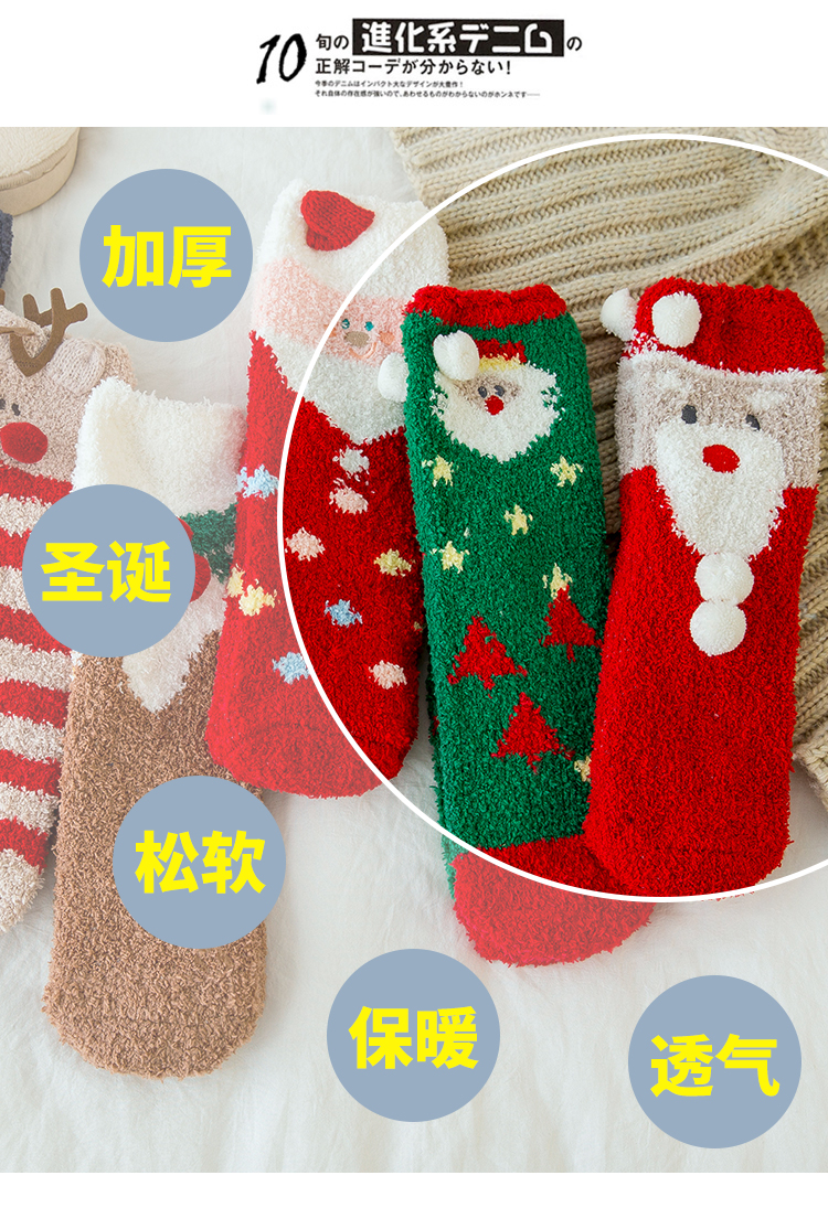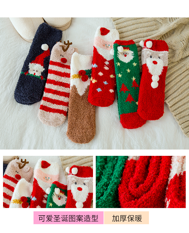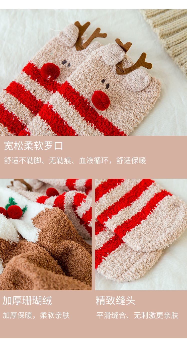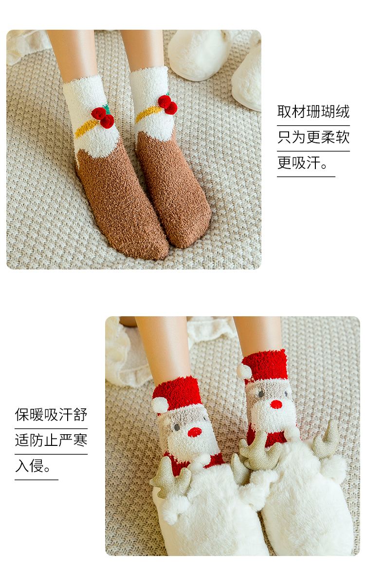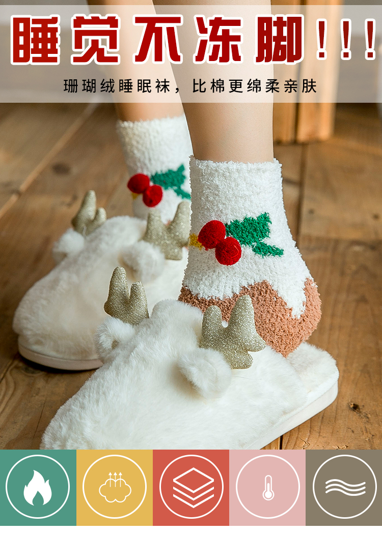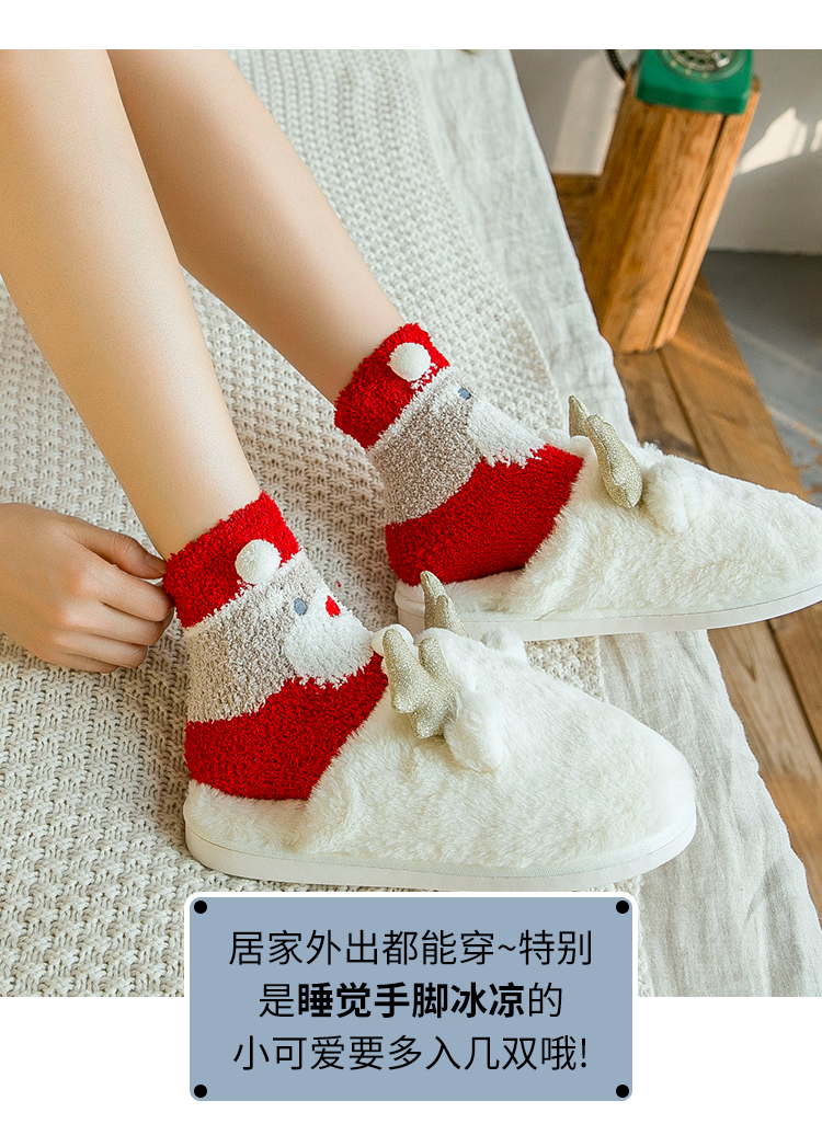 圣诞袜子女秋冬季中筒袜棉质加绒加厚睡眠袜珊瑚绒保暖可爱绒短袜