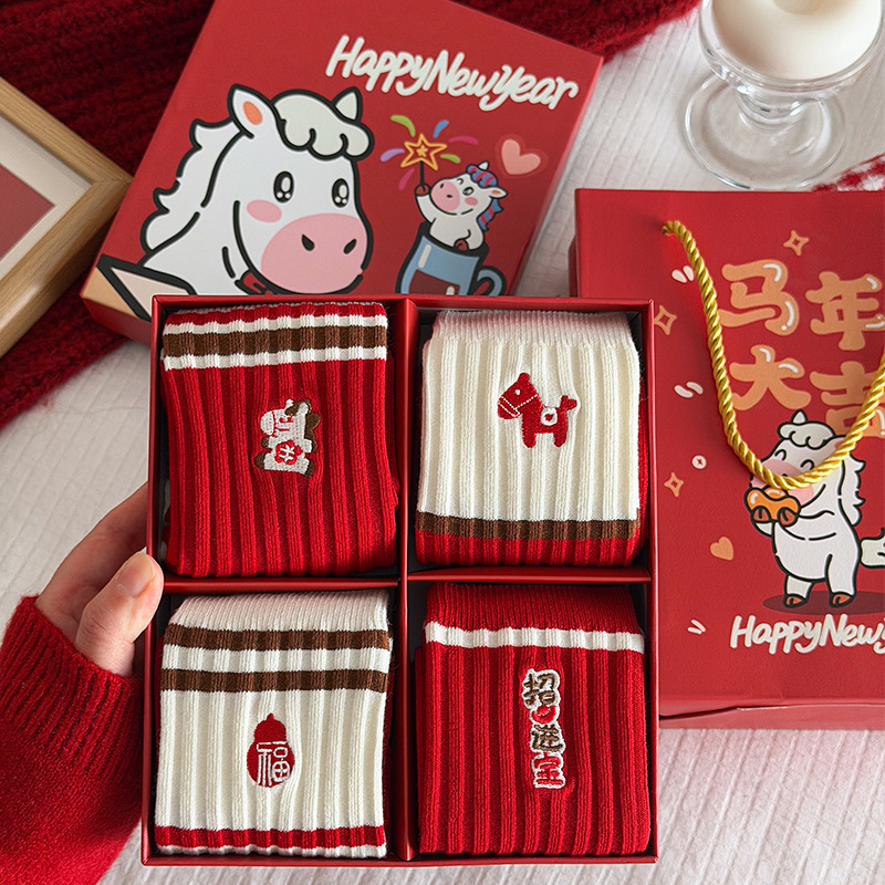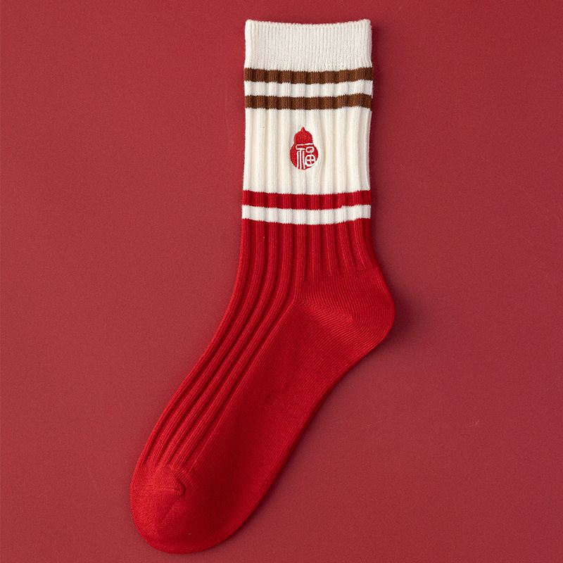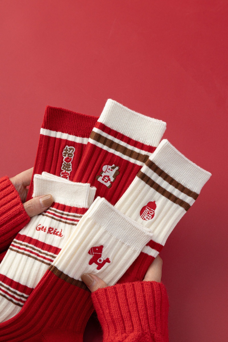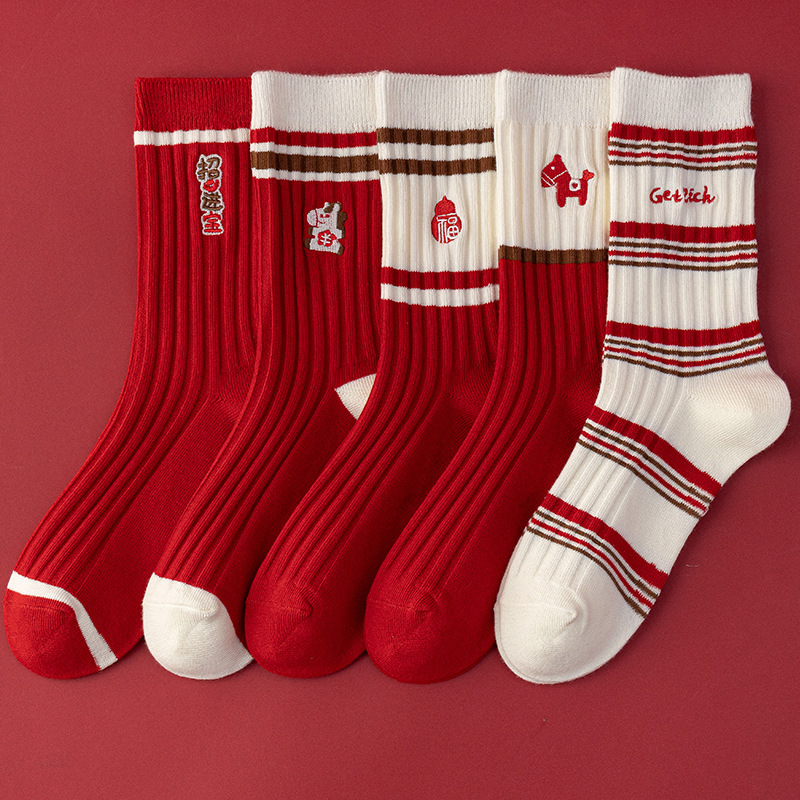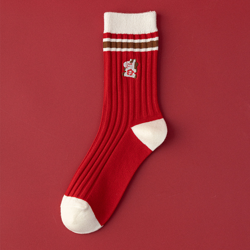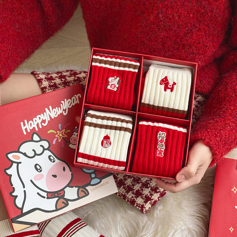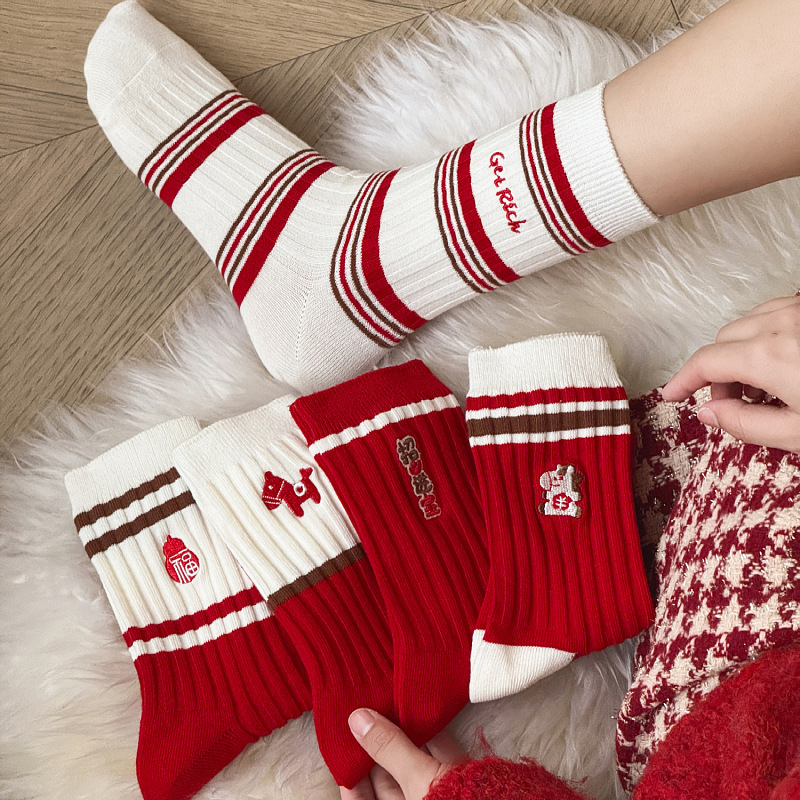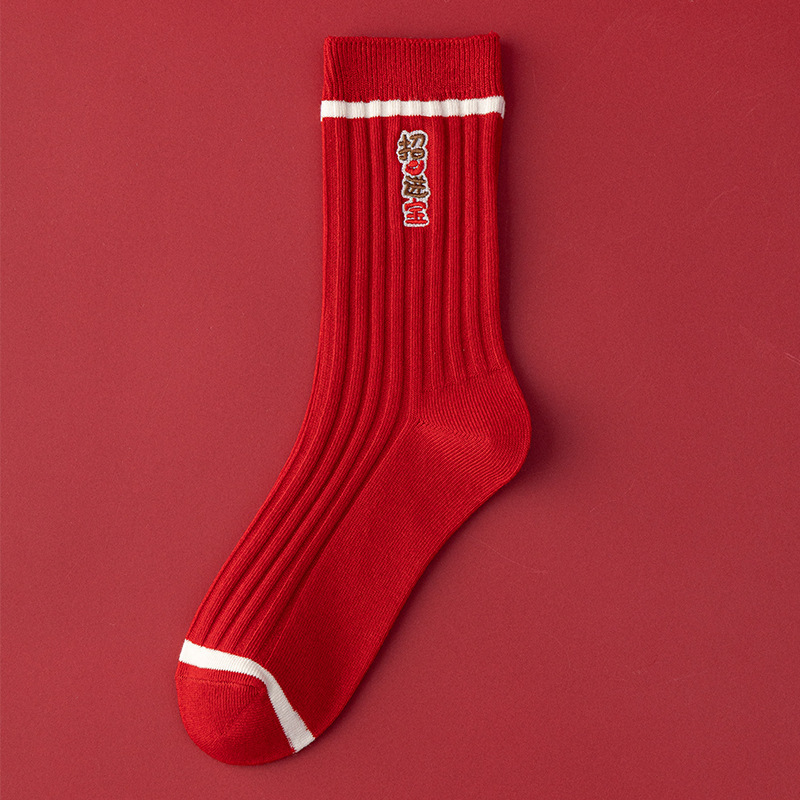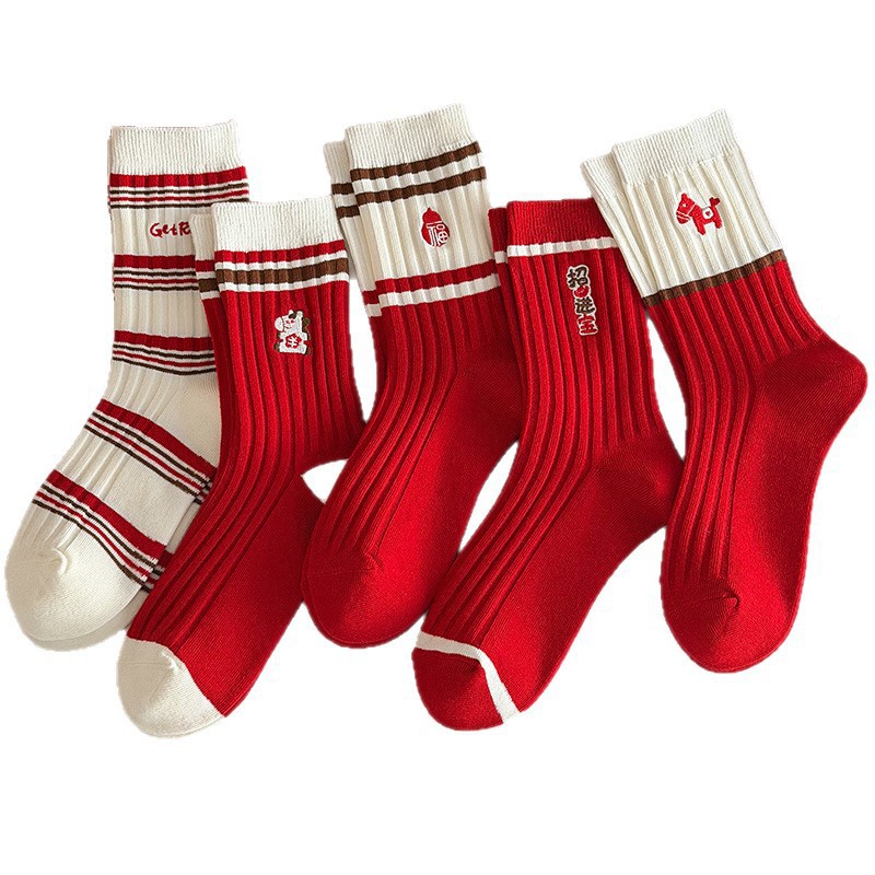 新年圣诞袜子女秋冬季礼盒刺绣袜子礼物情侣中筒袜子男结婚大红袜