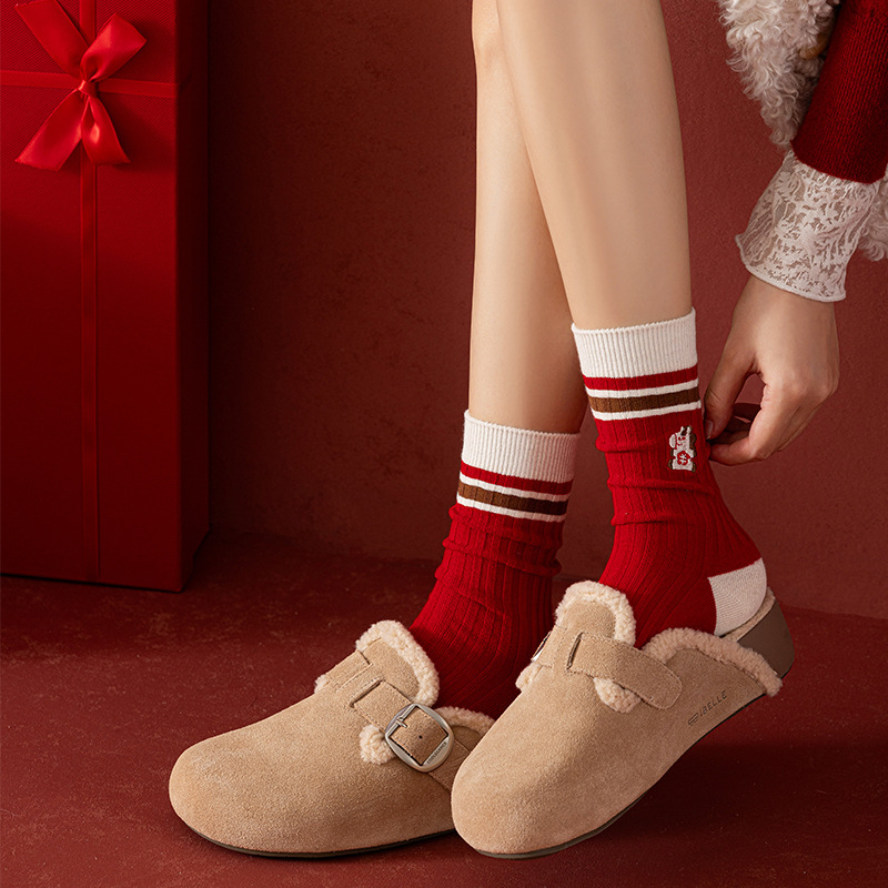 圣诞节礼物袜子女秋冬新年珊瑚绒加厚可爱堆堆袜本命年大红中筒袜