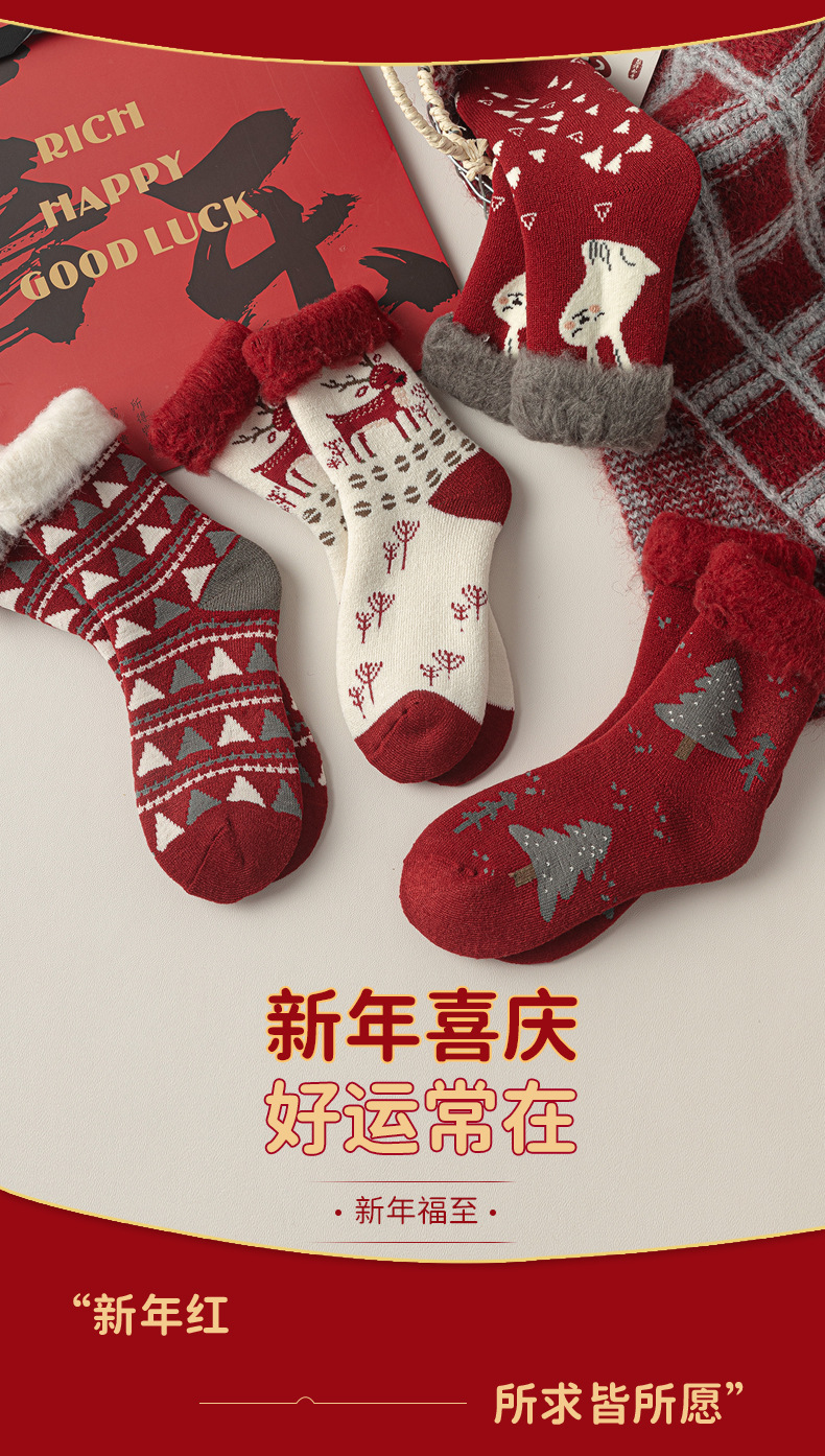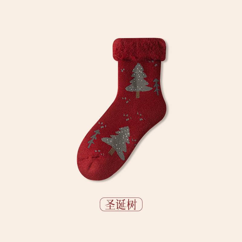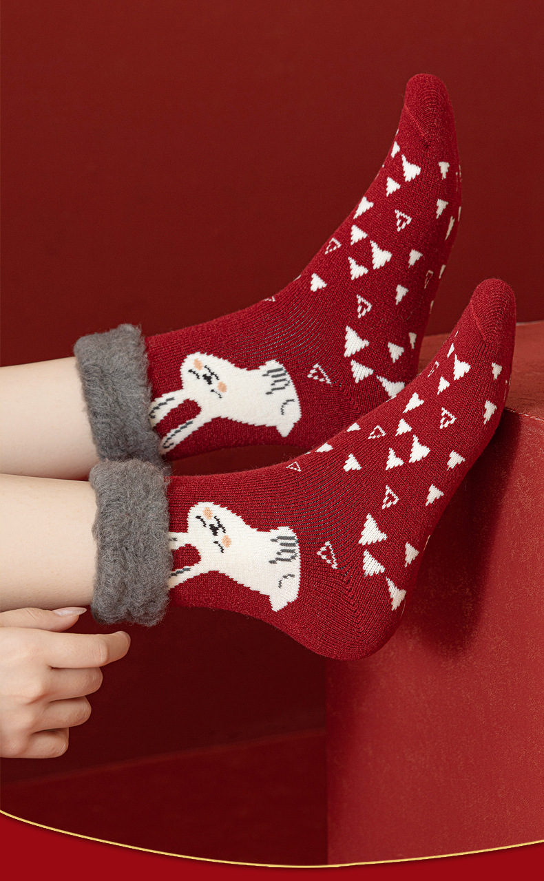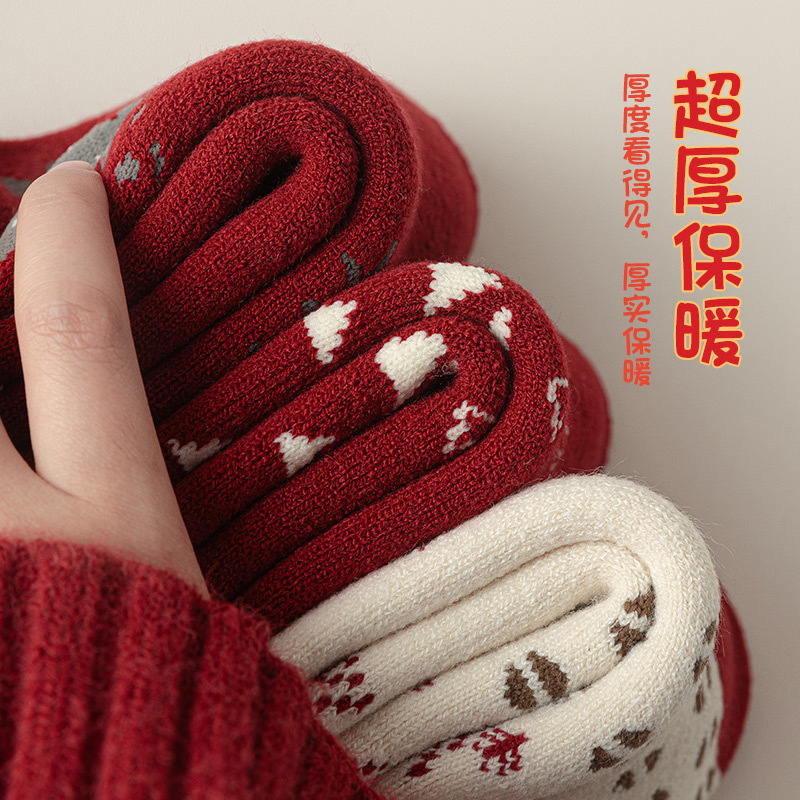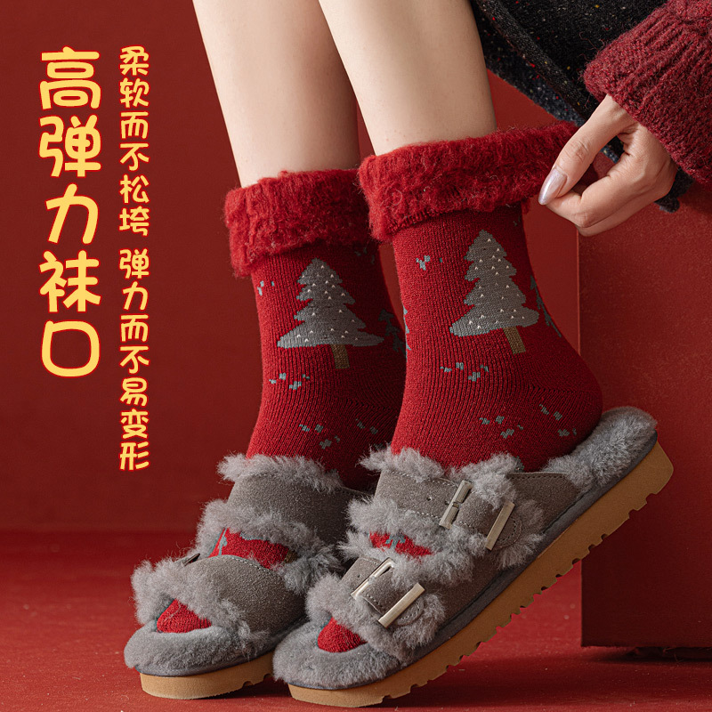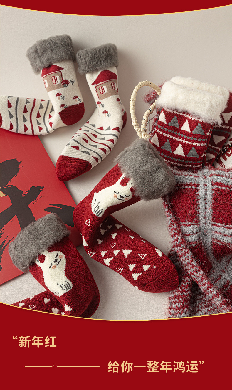 拉绒超厚毛圈大红袜冬季保暖新年袜圣诞中筒袜子女月子睡眠地板袜