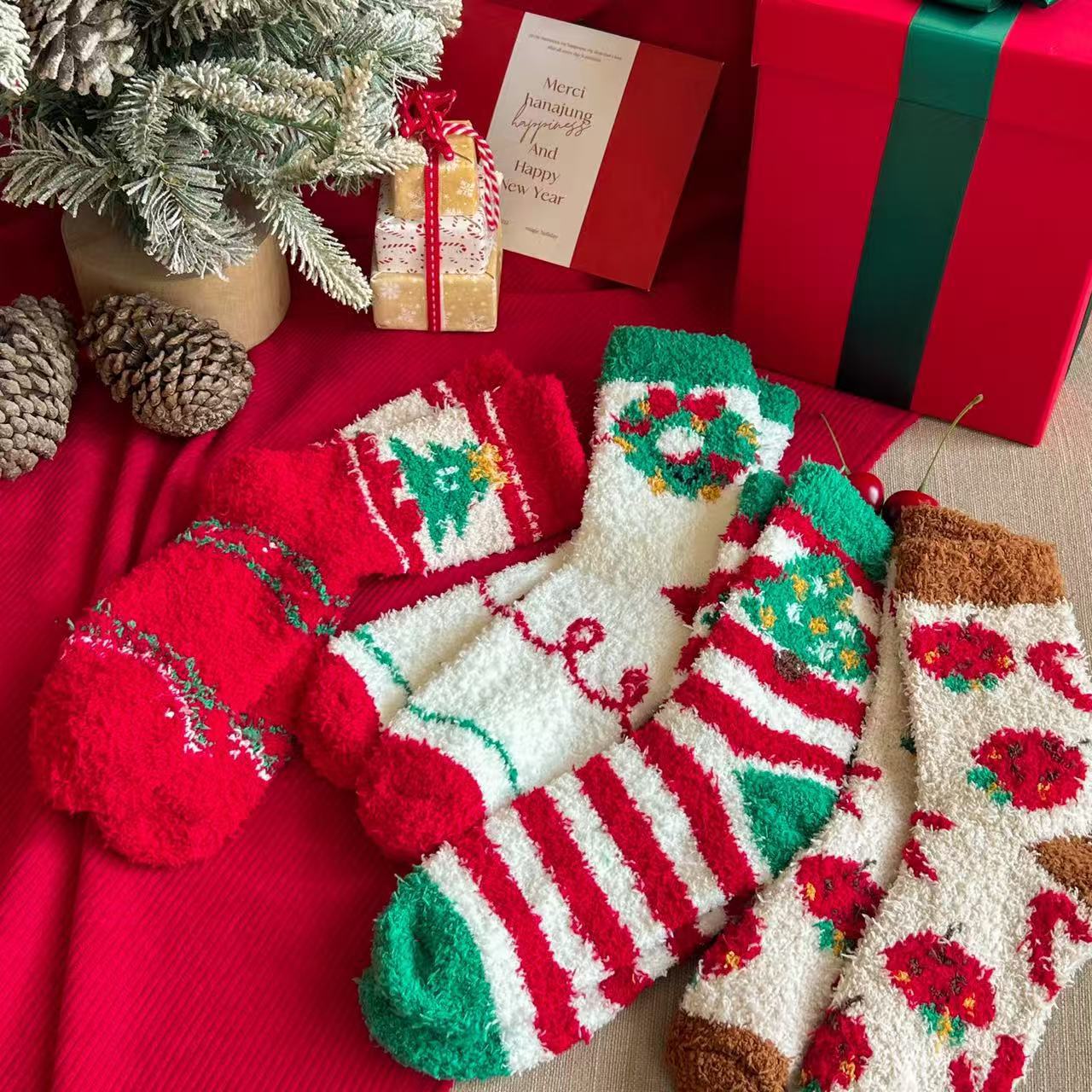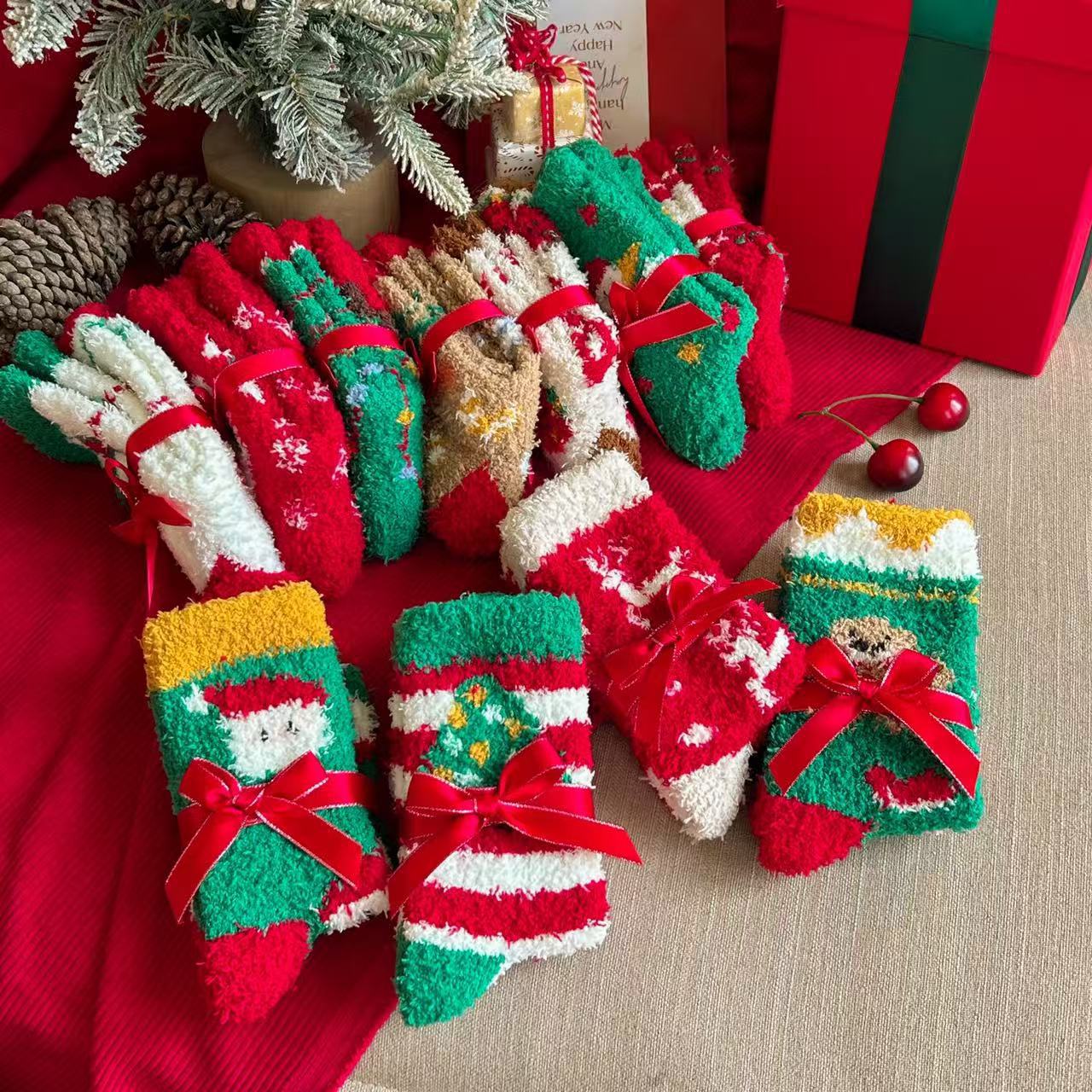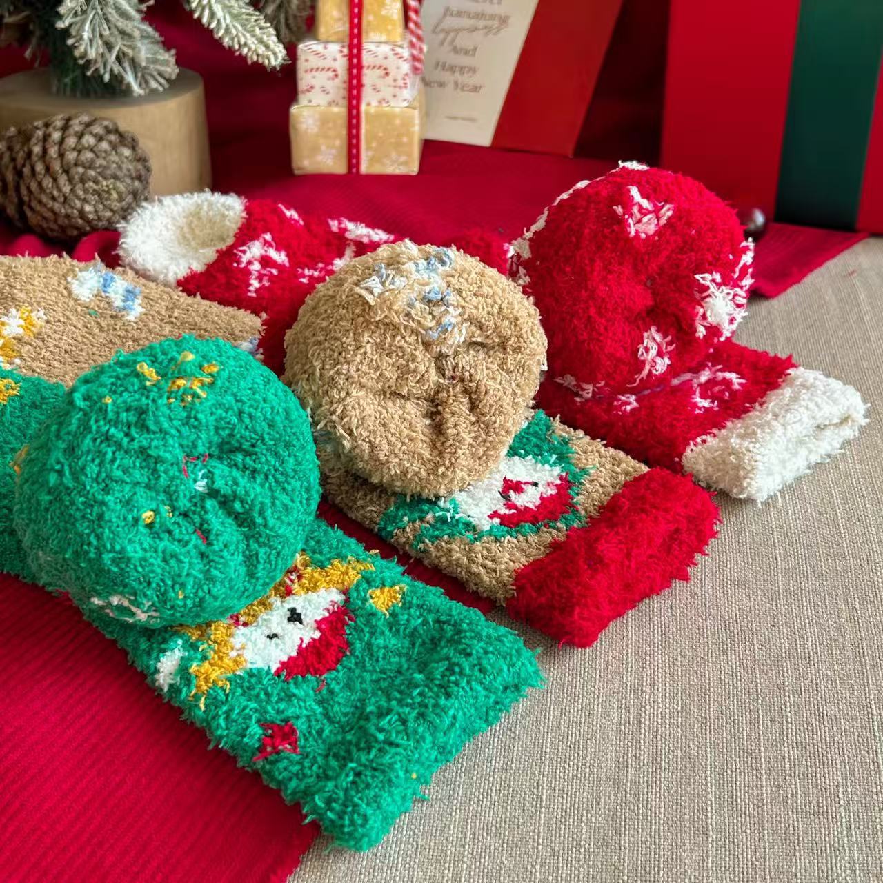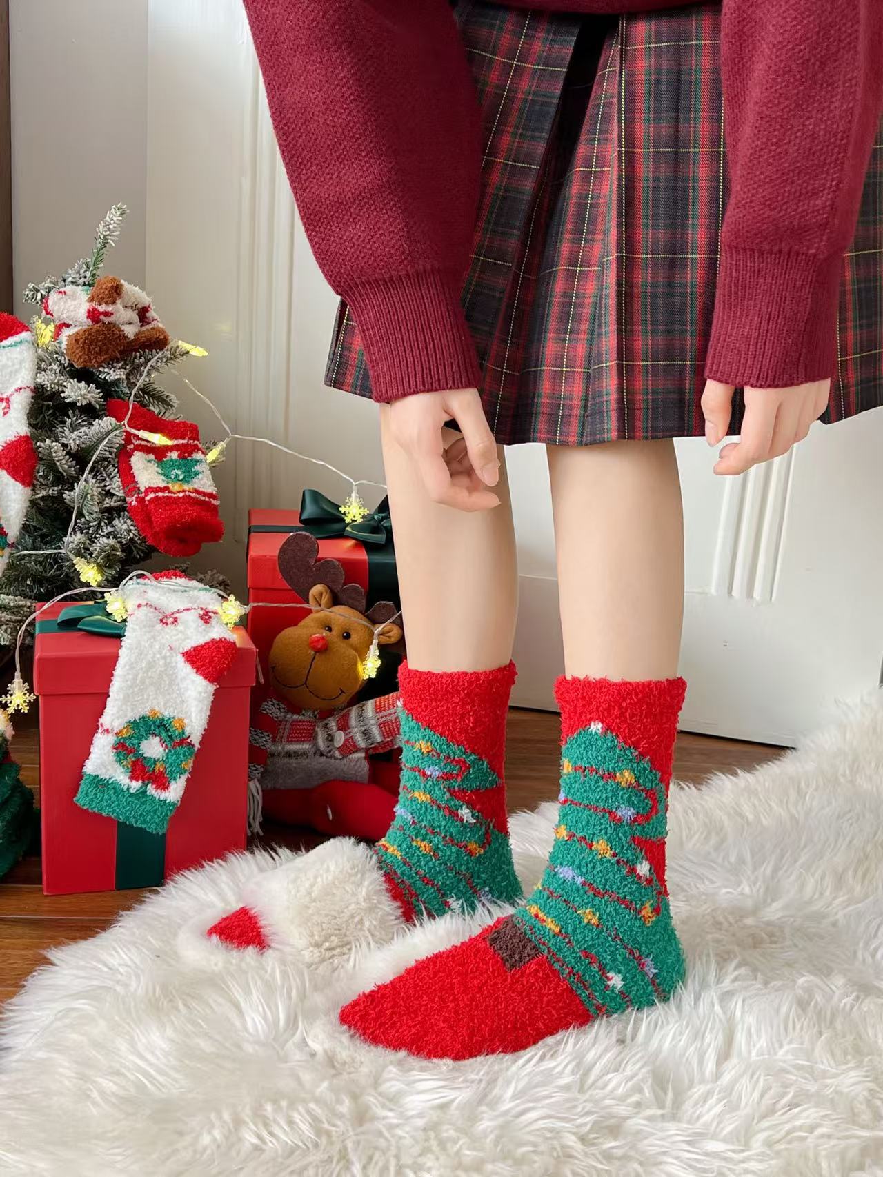 珊瑚绒圣诞袜子居家卡通可爱红色礼品长筒袜秋冬季潮