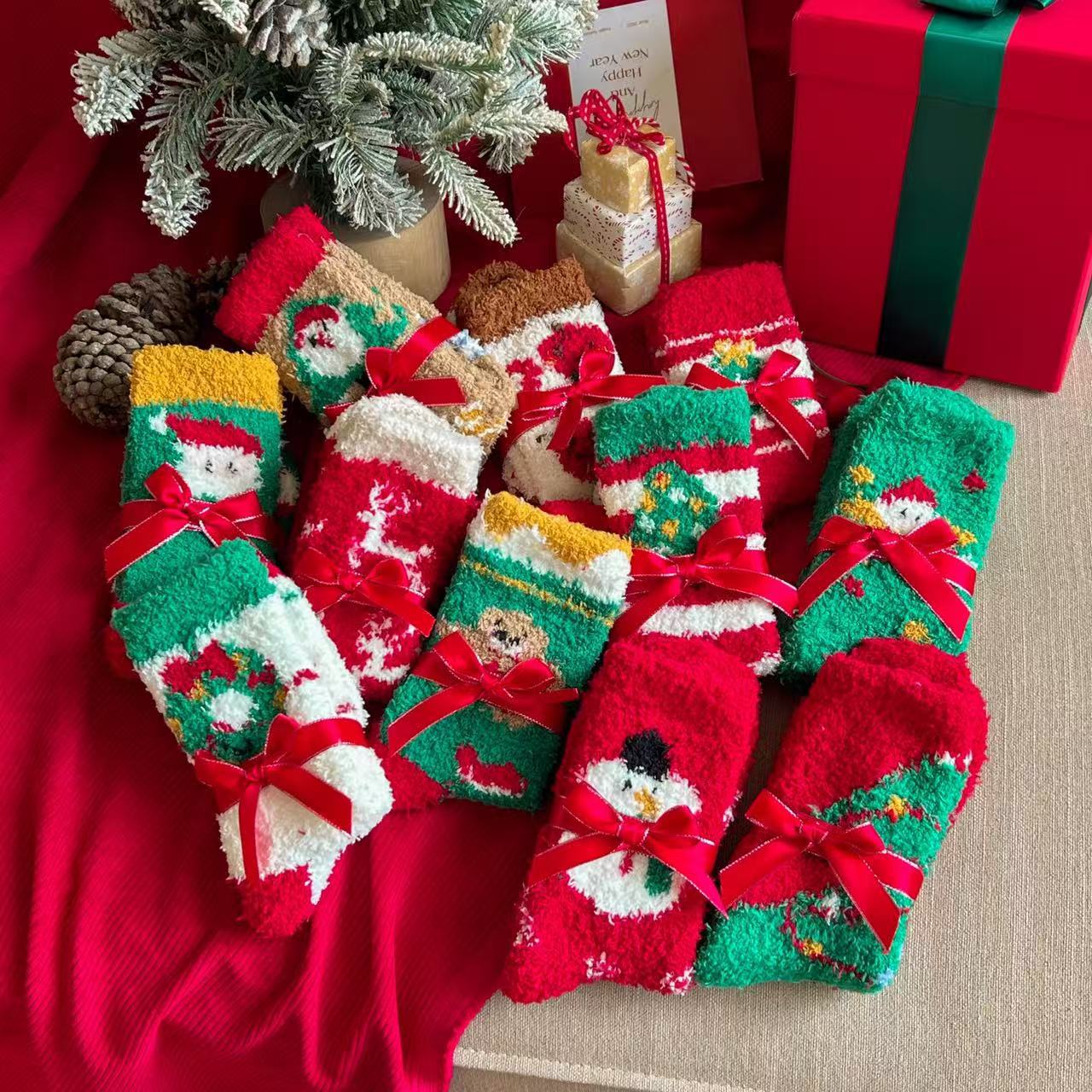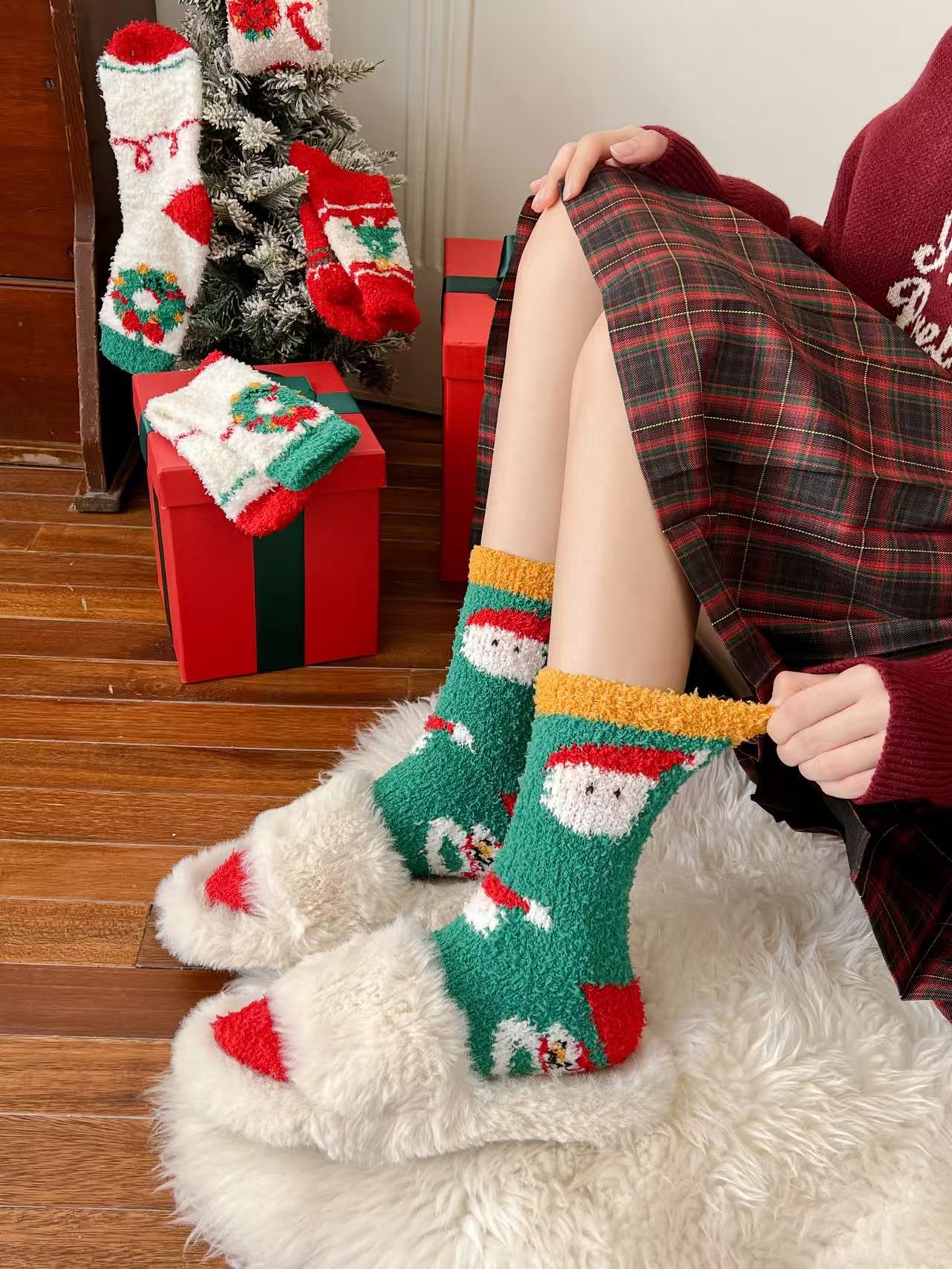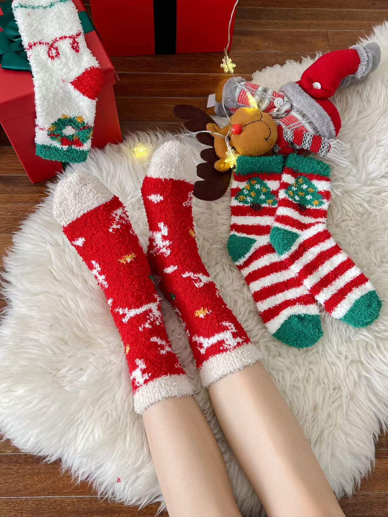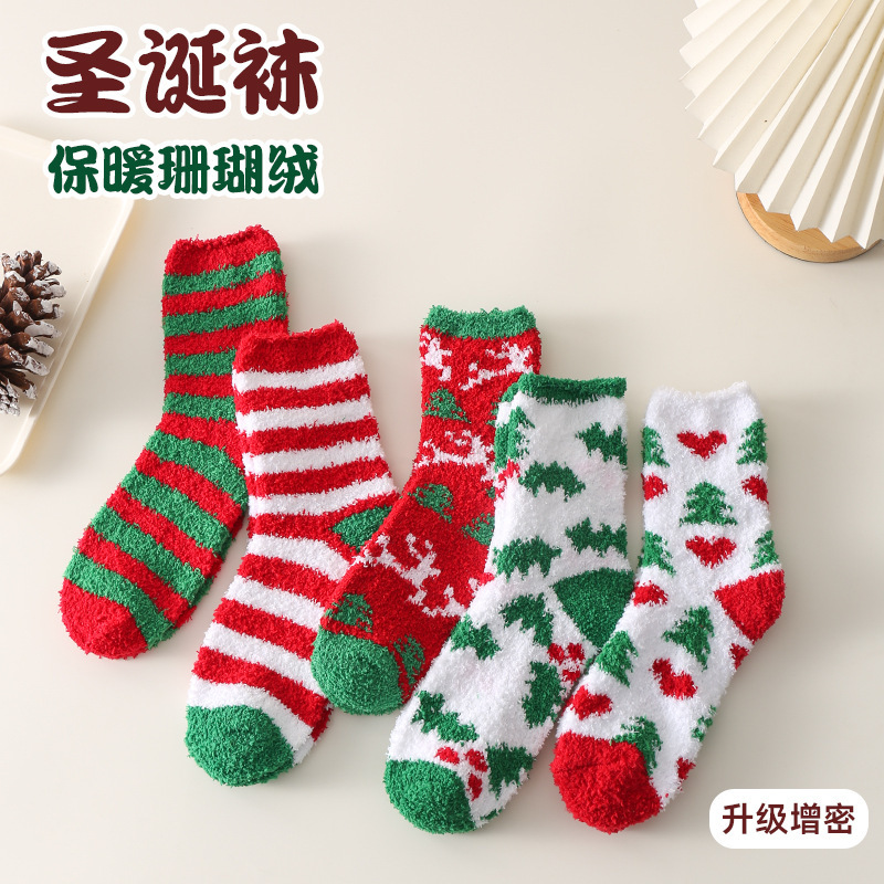 秋冬新款圣诞袜女珊瑚绒中筒袜女加厚保暖睡眠袜女卡通地板袜