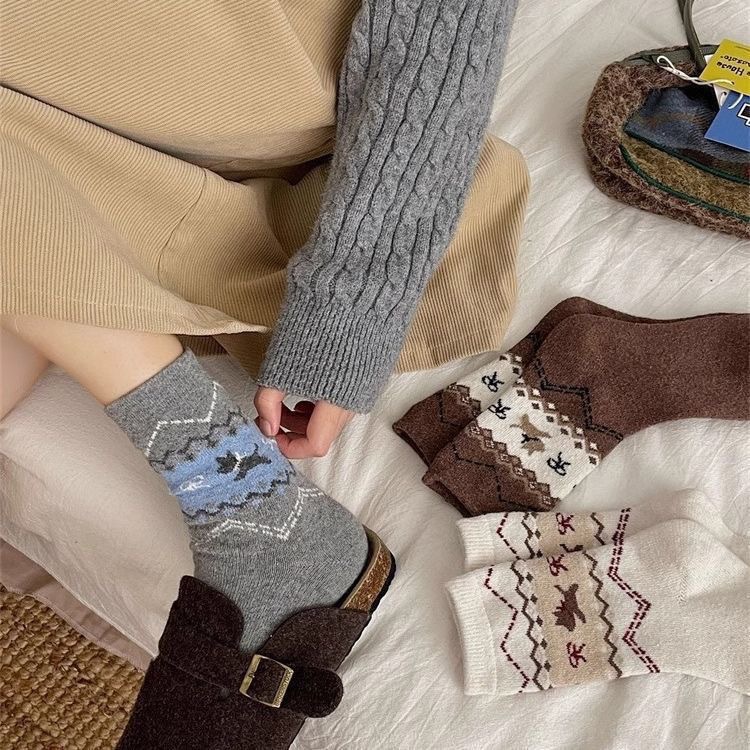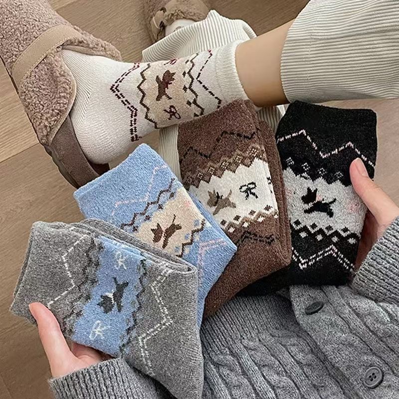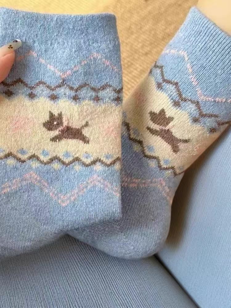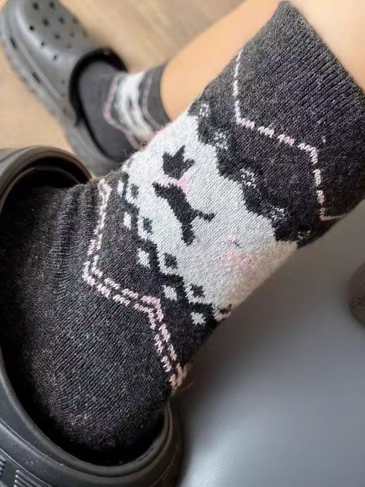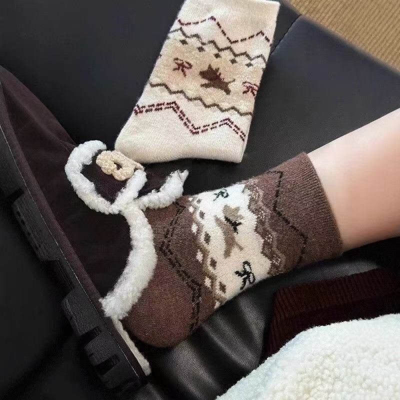费尔岛小狗蝴蝶结中筒袜冬季加厚保暖复古圣诞风配雪地靴长筒袜子