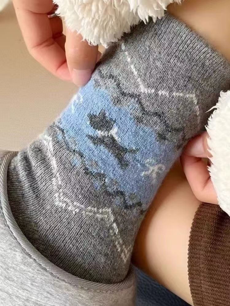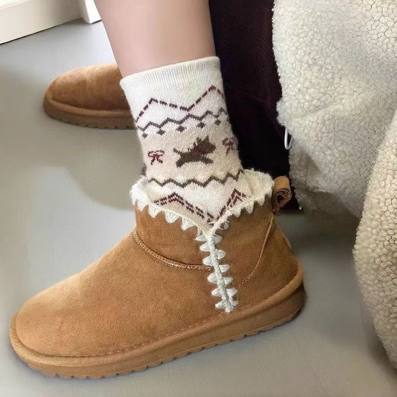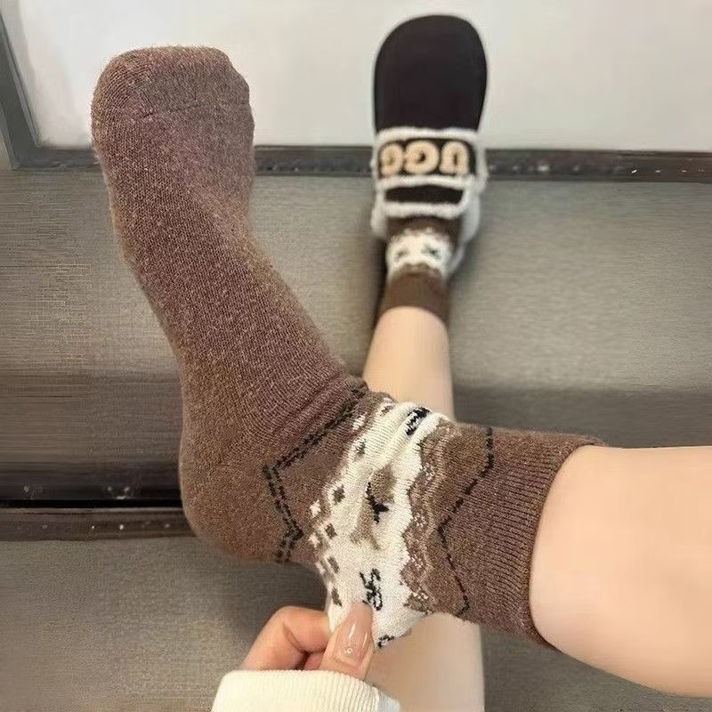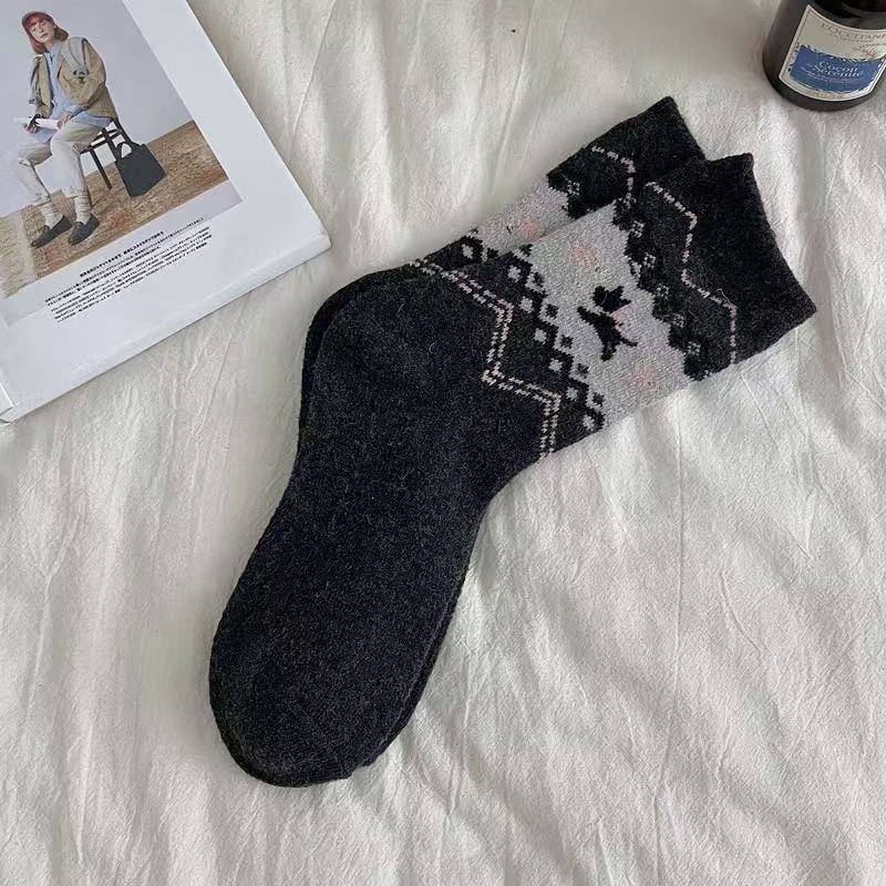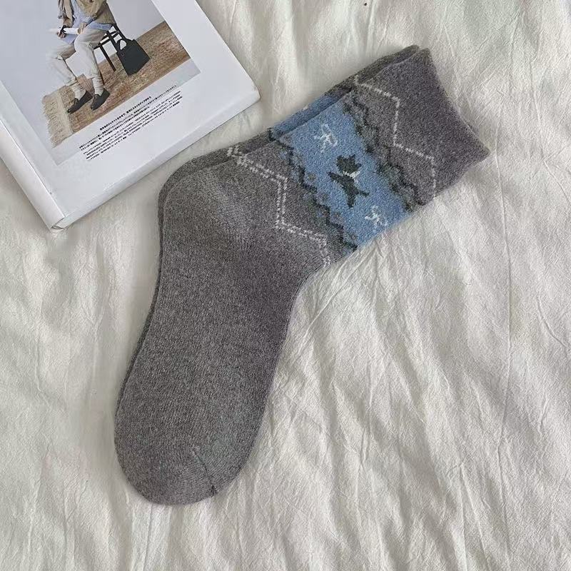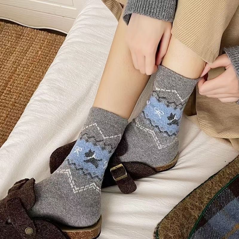 费尔岛小狗蝴蝶结中筒袜冬季加厚保暖复古圣诞风配雪地靴长筒袜子