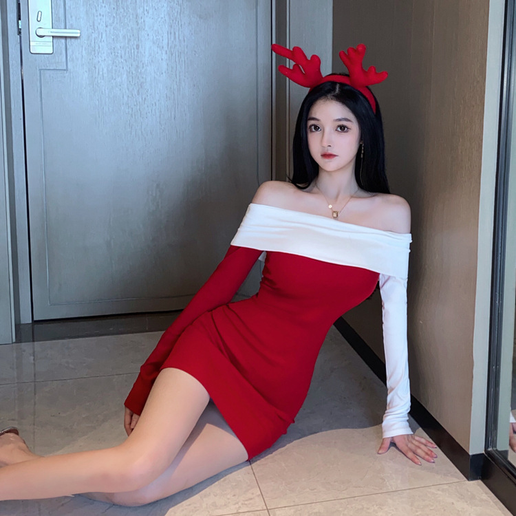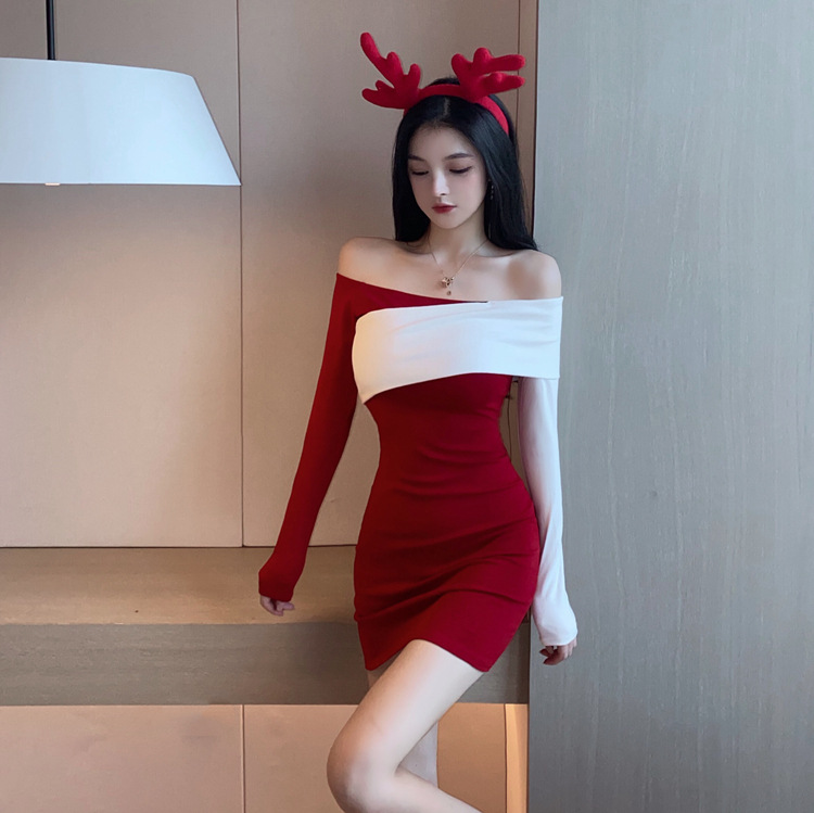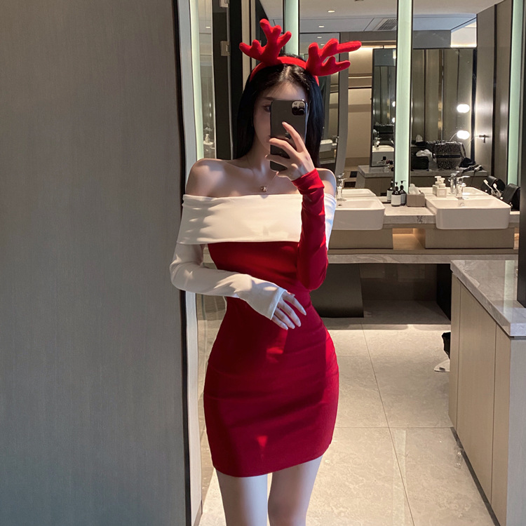 气质撞色拼接一字肩长袖连衣裙新年圣诞直播衣服女主播礼服