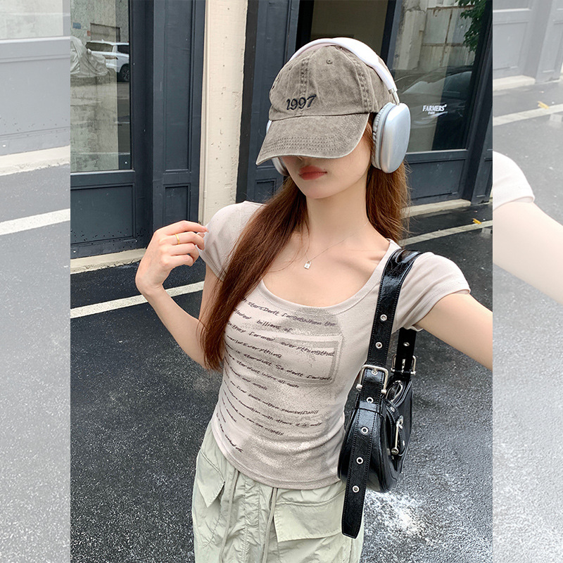 美式字母印花短袖t恤女新款夏季修身显瘦甜辣妹正肩短款上衣