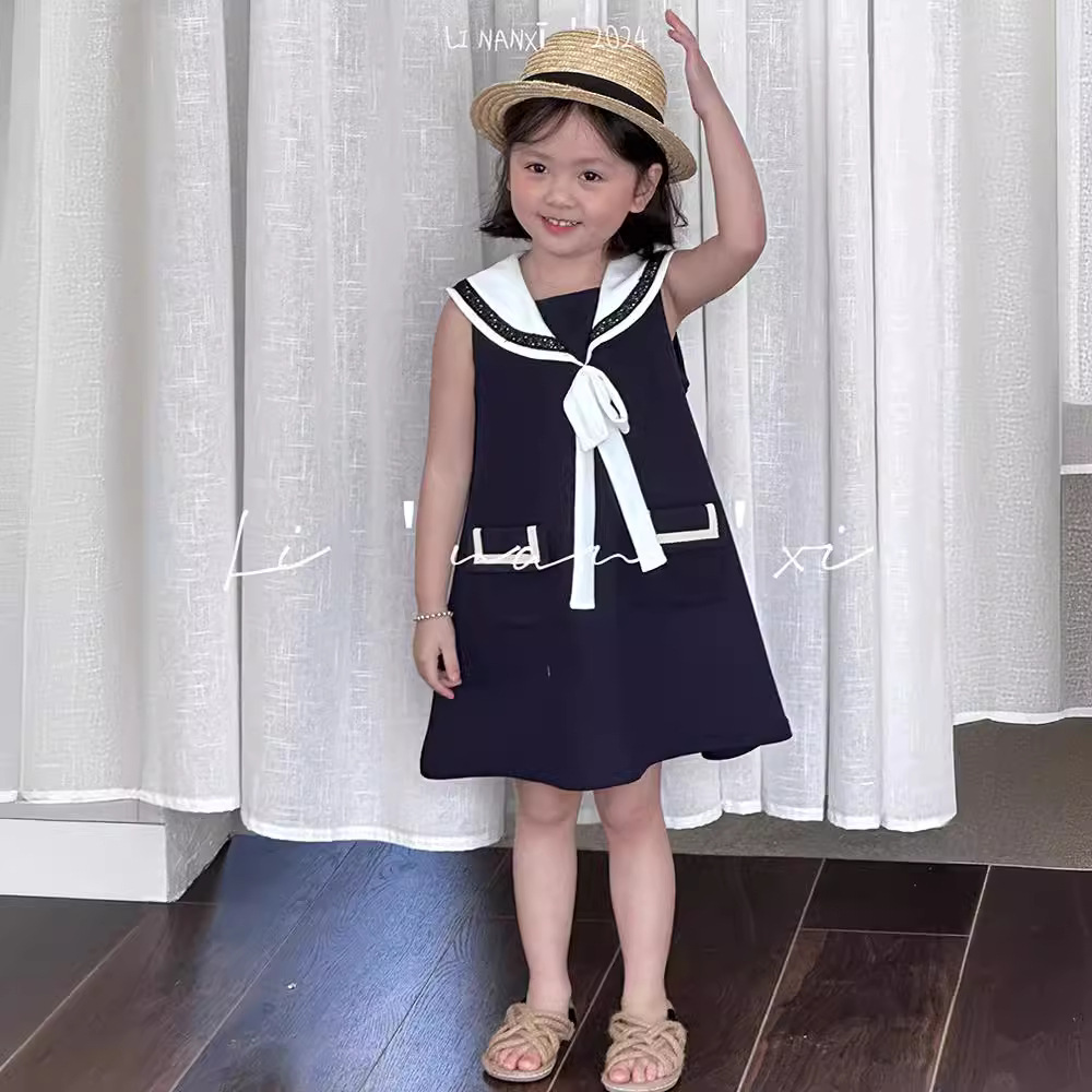 24夏新款女童海军领学院风针织连衣裙蝴蝶结A字裙赫本风淑女裙