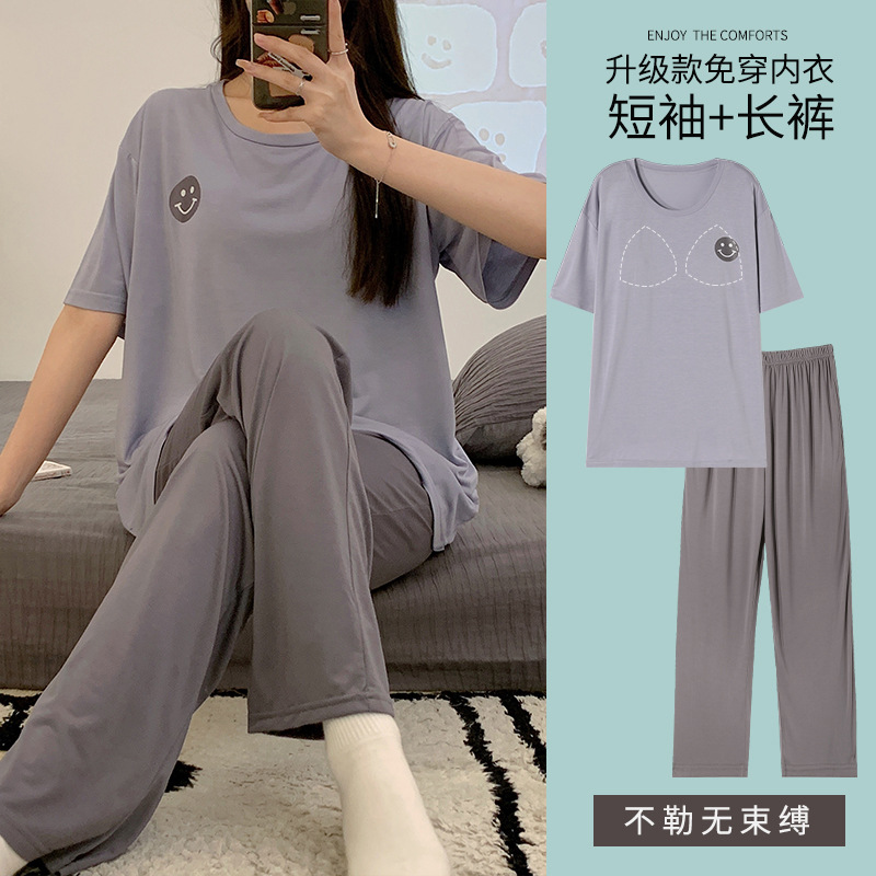 带胸垫一体睡衣女士夏季纯棉薄款短袖长裤防凸点可外穿家居服套装