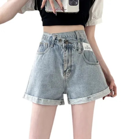 牛仔短裤女ins潮斜扣不规则夏高腰宽松百搭直筒卷边阔腿a字热裤子