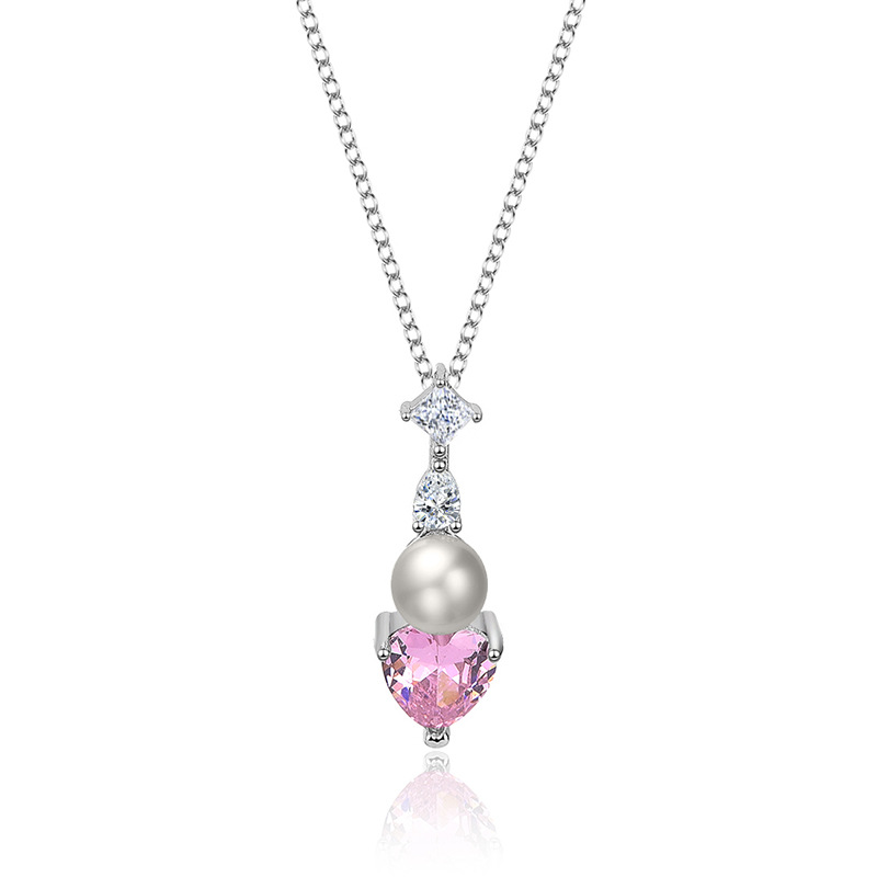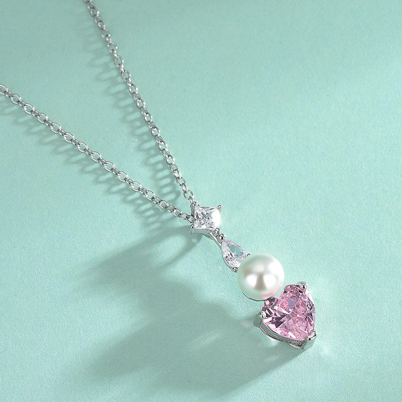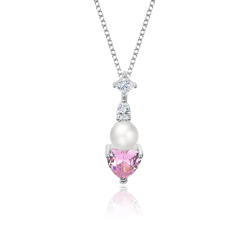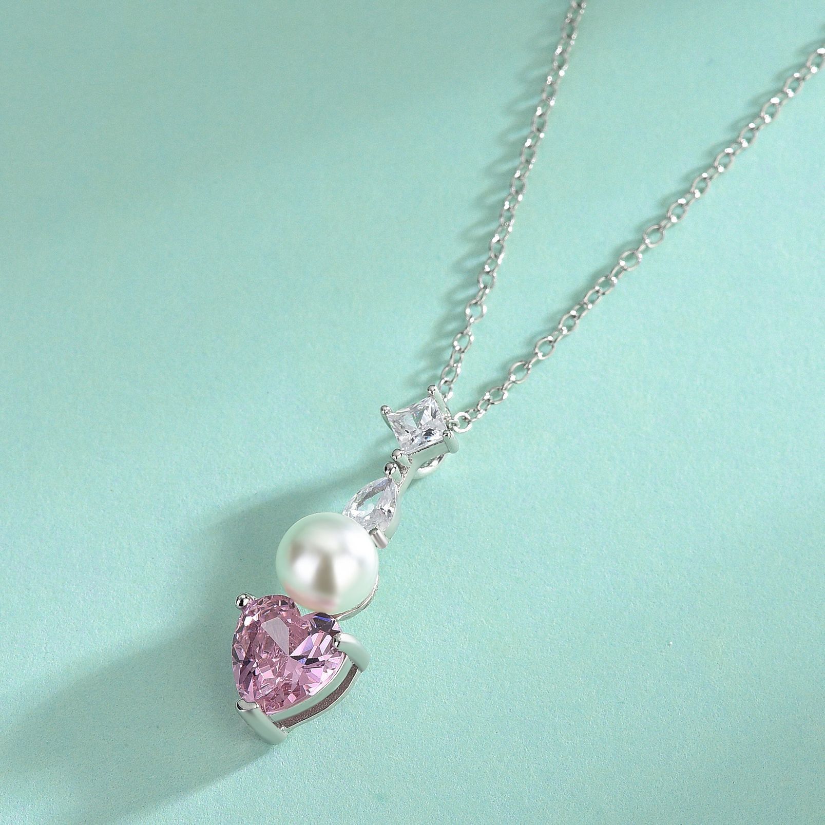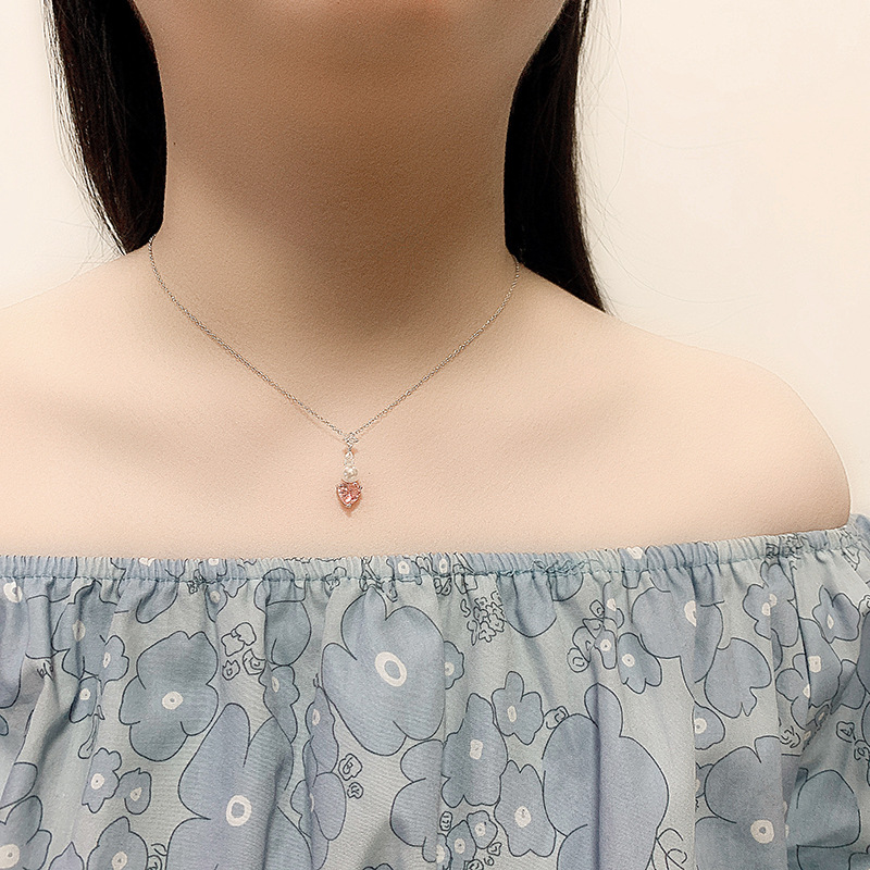S925纯银粉色心形锆石吊坠气质冷淡风珍珠项链女小众锁骨链首饰