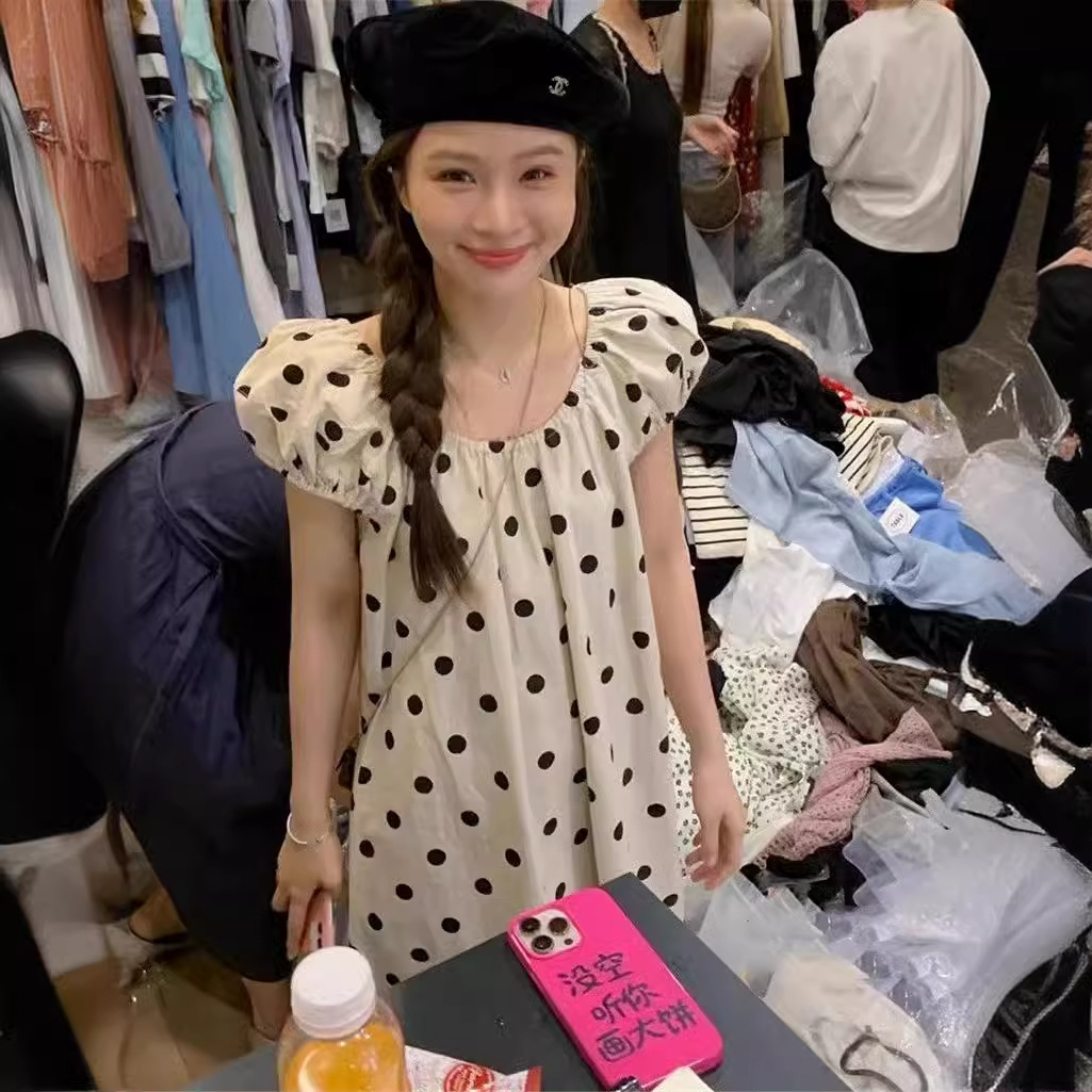 小个子夏季新款泡泡袖韩版气质波点温柔风系带甜美宽松减龄连衣裙