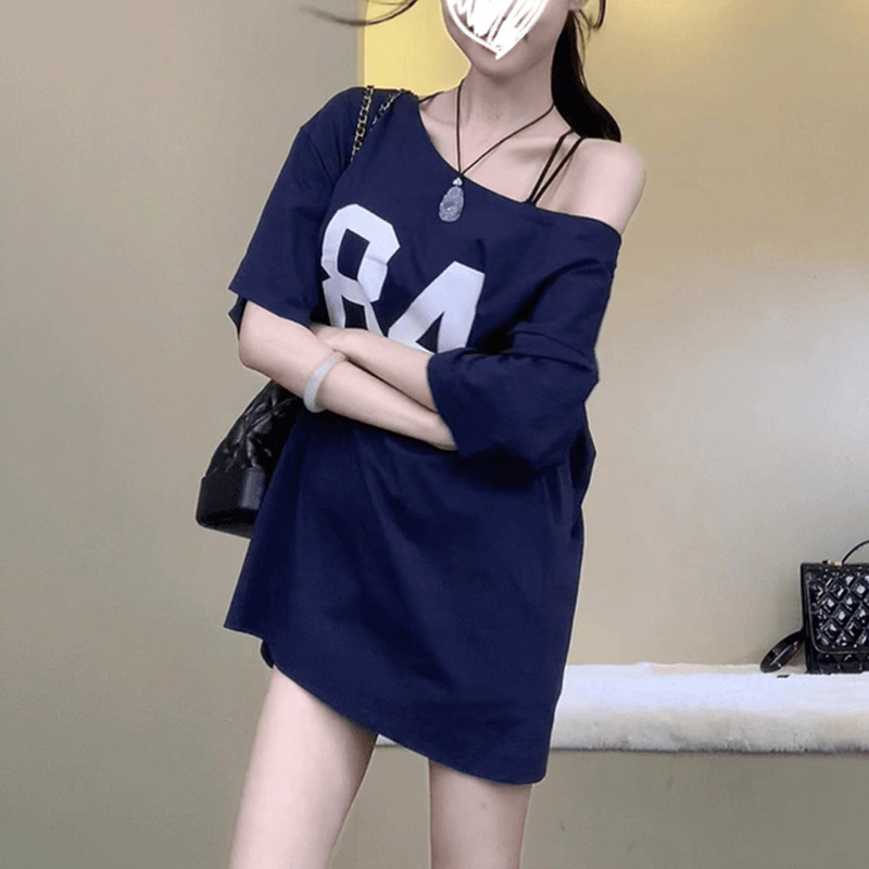 夏秋季新款套头圆领百搭设计感宽松休闲露肩字母印花T恤女上衣