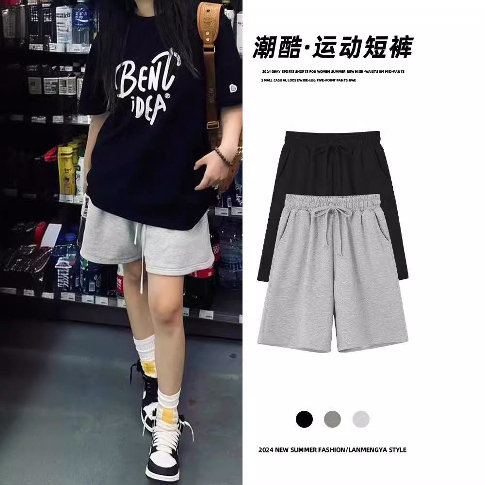 灰色运动短裤女夏季薄款高腰显瘦直筒阔腿中裤外穿休闲宽松五分裤