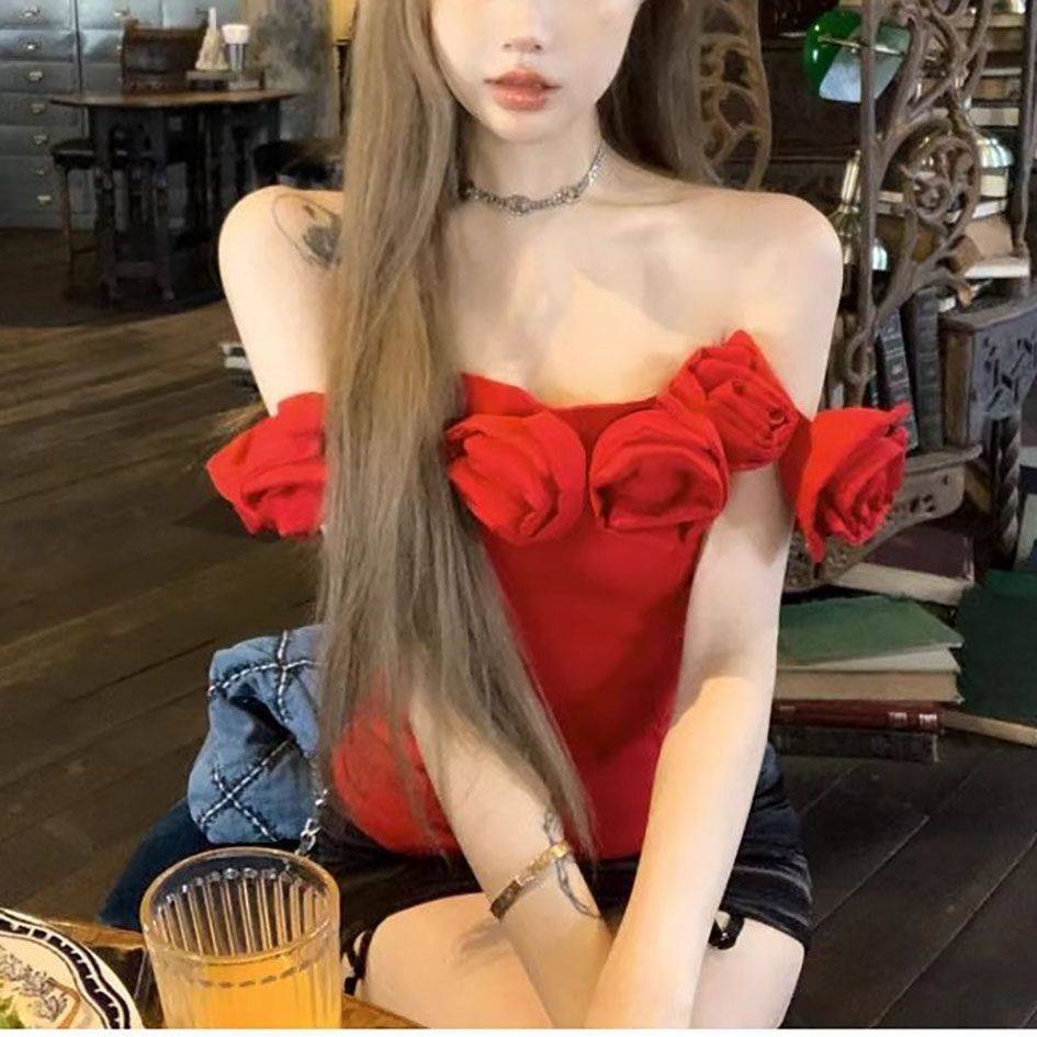 【月销10万】立体花朵一字露肩背心女夏短款修身显瘦抹胸吊带上衣