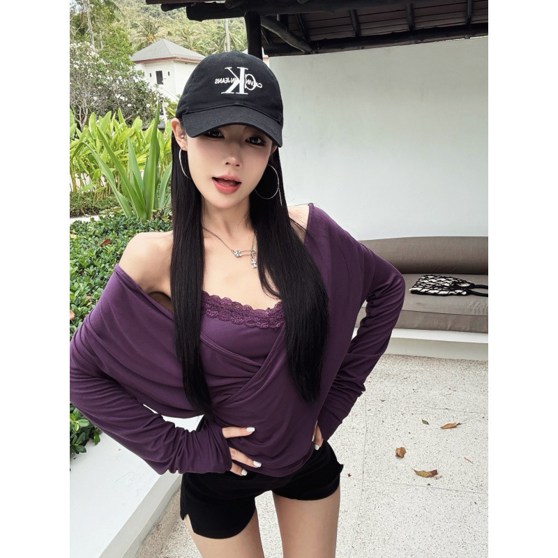 辣妹v领长袖T恤女设计感套装蕾丝拼接