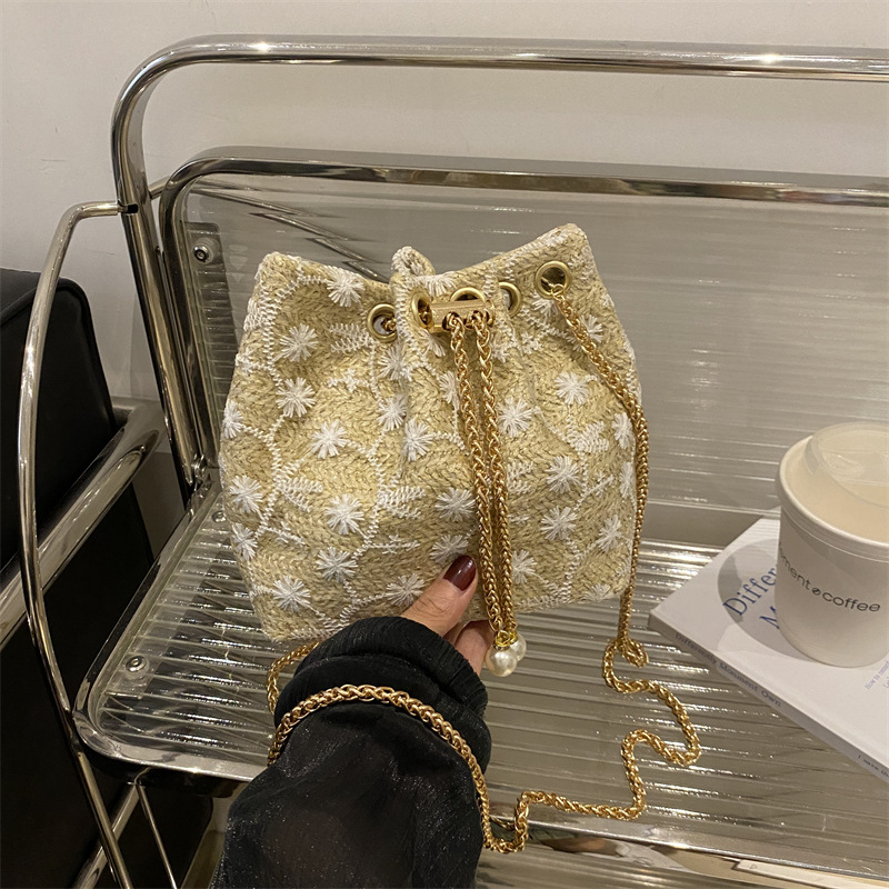 高颜值草编珍珠单肩斜挎包夏季新款时尚蕾丝刺绣链条水桶包女
