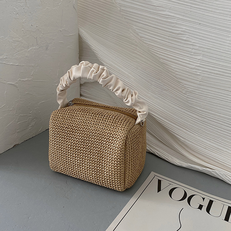 草编包女夏季法式小众百搭手提新款链条编织豆腐包撞色斜挎包