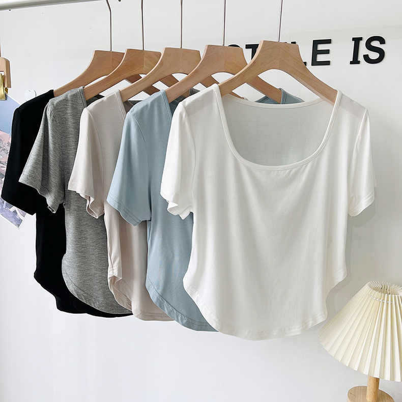 纯色莫代尔方领正肩短袖t恤女夏季修身短款打底休闲薄款上衣