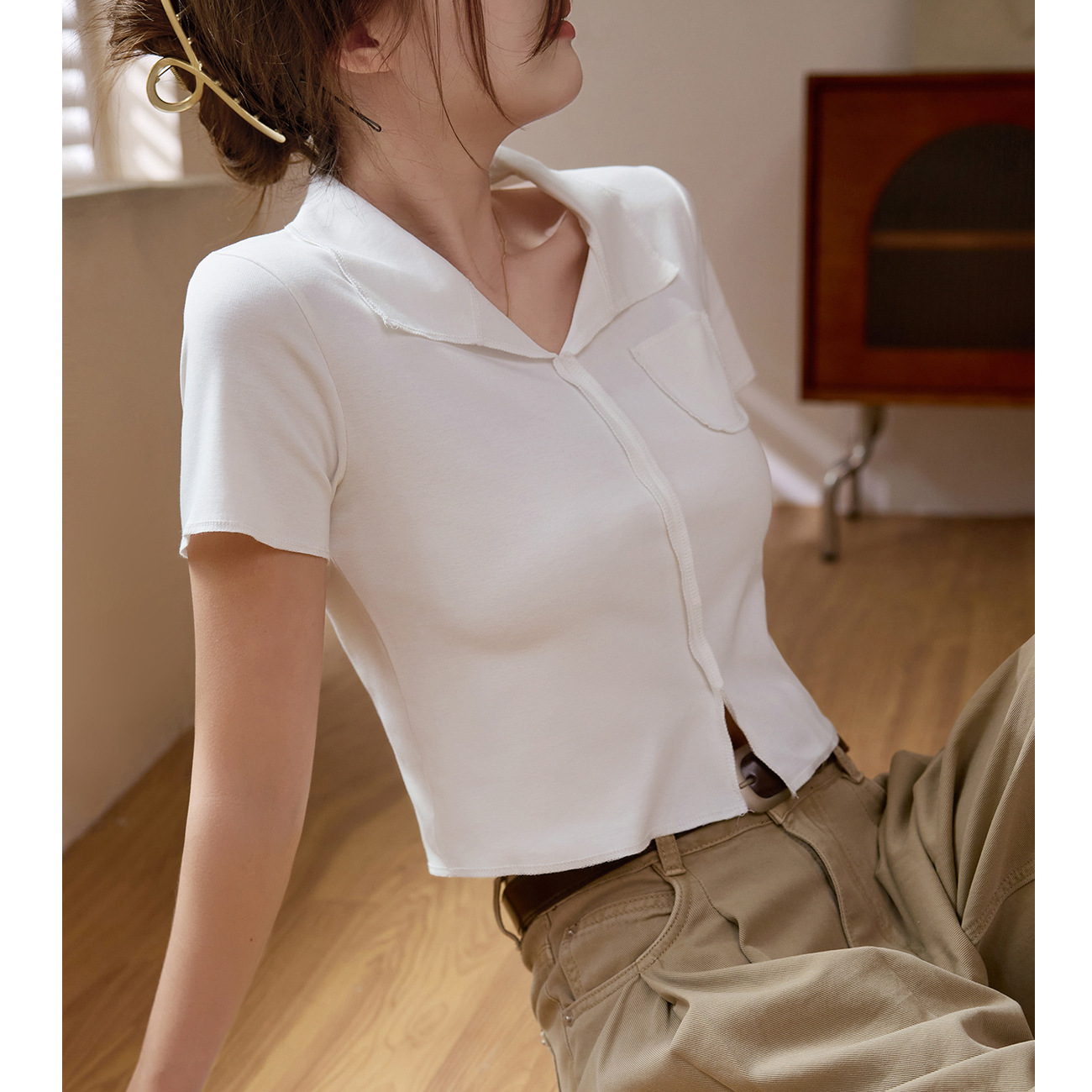 #甄选纯棉#明线设计感高级T恤女夏2025新款高腰短款翻领短袖上衣