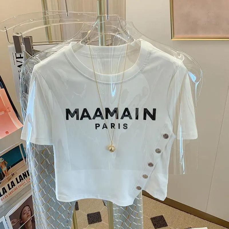 不对称侧边斜排扣英文字母印花T恤夏季新款不规则短款上衣ins