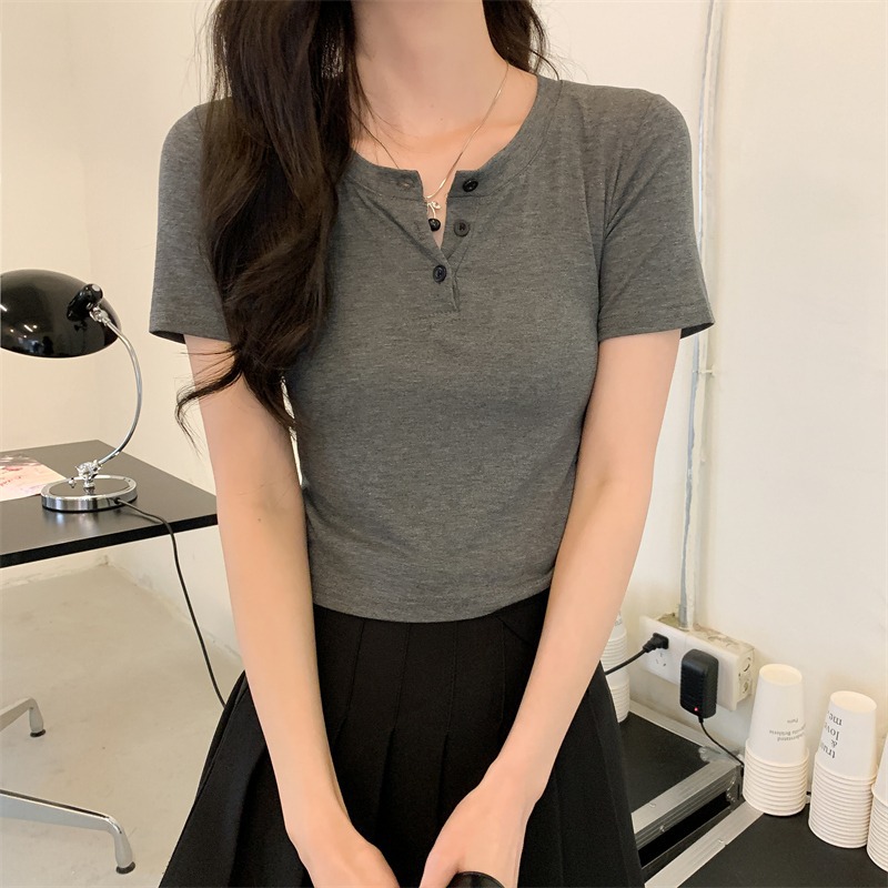 纯棉V领短袖T恤女装新款夏季短款露脐设计感小众洋气上衣服