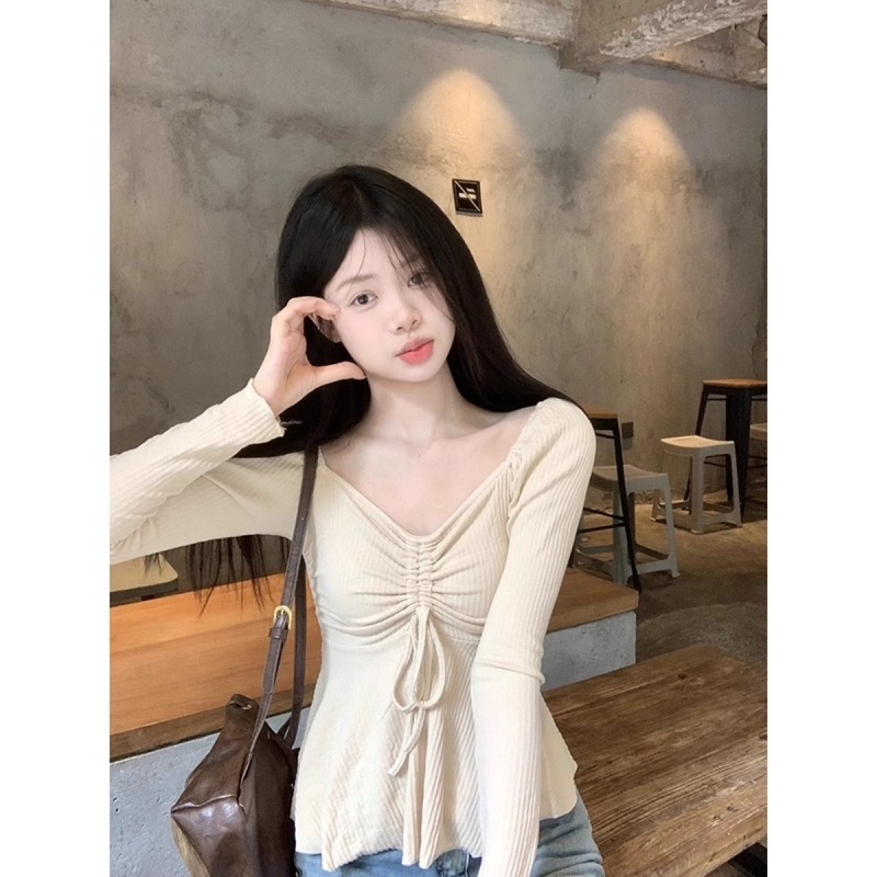 甜辣妹V领打底衫女2025新款春秋纯欲风显瘦别致设计感长袖T恤上衣
