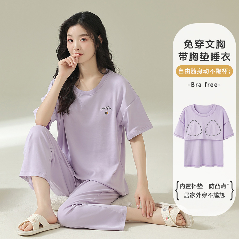 新款带胸垫睡衣女夏季纯棉短袖七分裤休闲女士可外穿家居服
