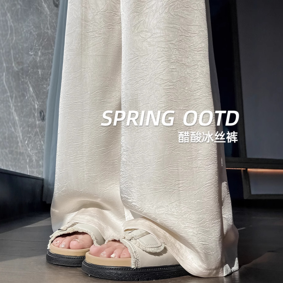 白色醋酸缎面阔腿裤女夏季薄款高腰垂感窄版直筒中式国风冰丝裤子