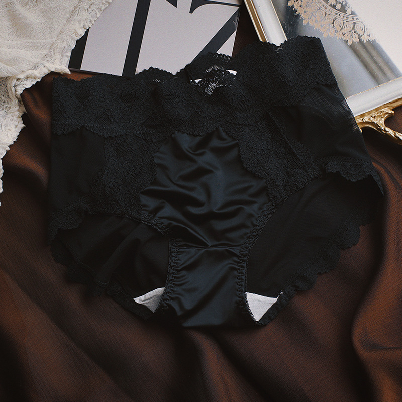 缎面蕾丝内裤女士冰丝透气桑蚕丝裆网纱包臀中高腰三角裤