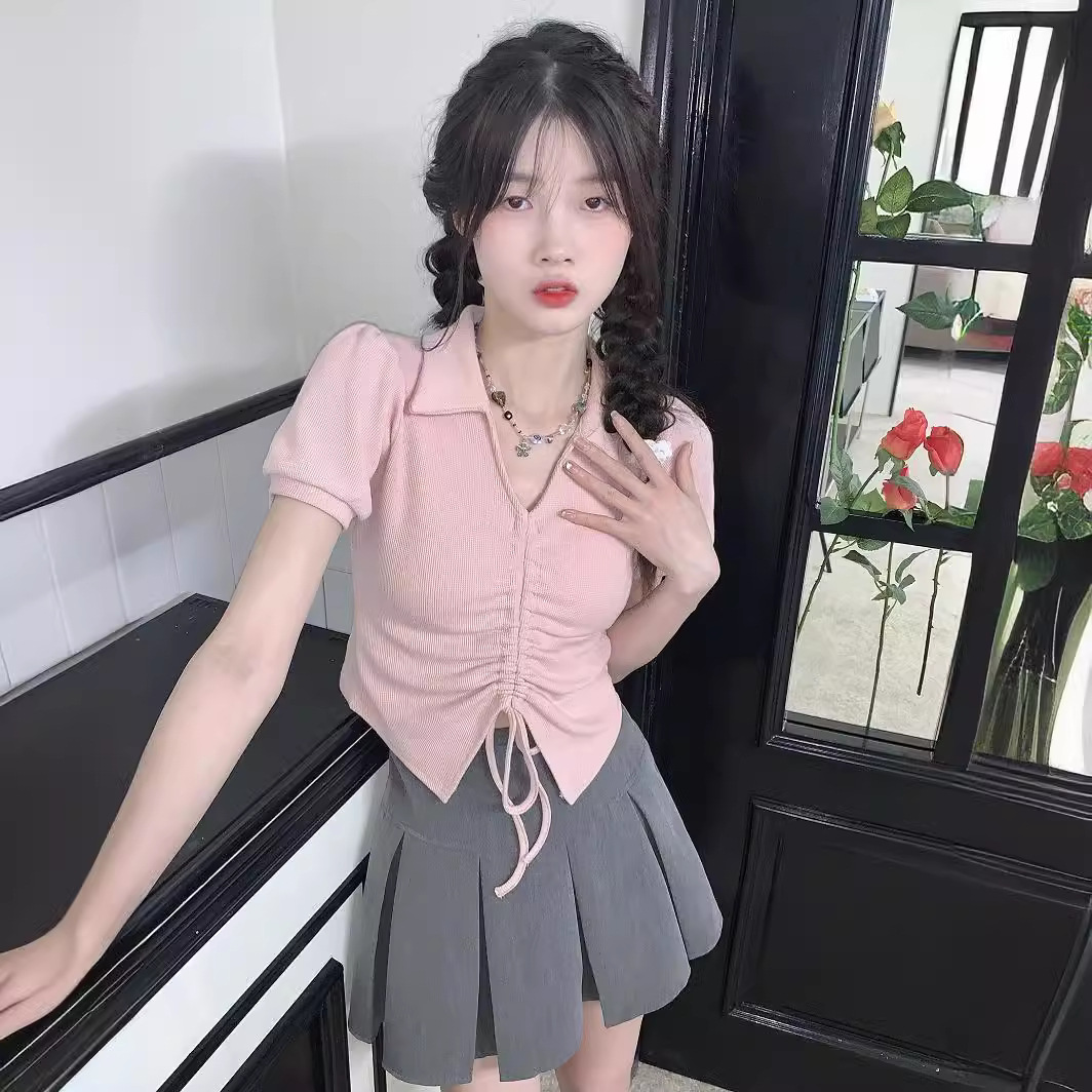 华夫格棉T恤女短袖2025年新款爆款短款抽绳上衣夏polo领衫设计感
