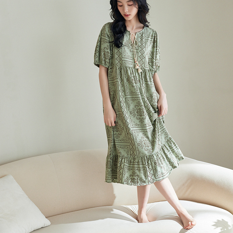 【凉感型】睡裙夏季女款短袖纯棉时尚民族风可外穿长款睡衣连衣裙