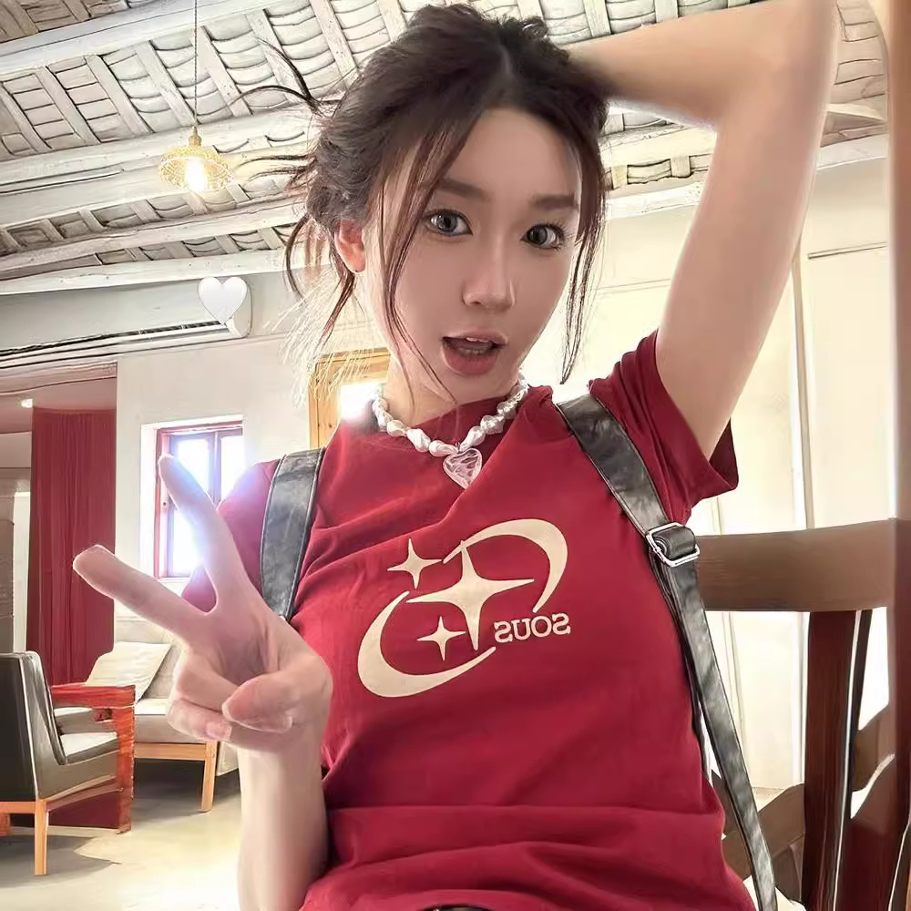 夏季ins美式修身显廋正肩t恤复古设计感小众短款辣妹短袖上衣女潮