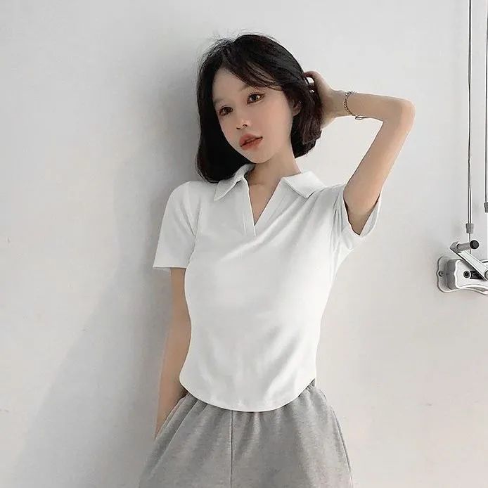 辣妹纯欲白色V领短袖t恤夏纯色百搭短款修身ins超火polo领上衣女
