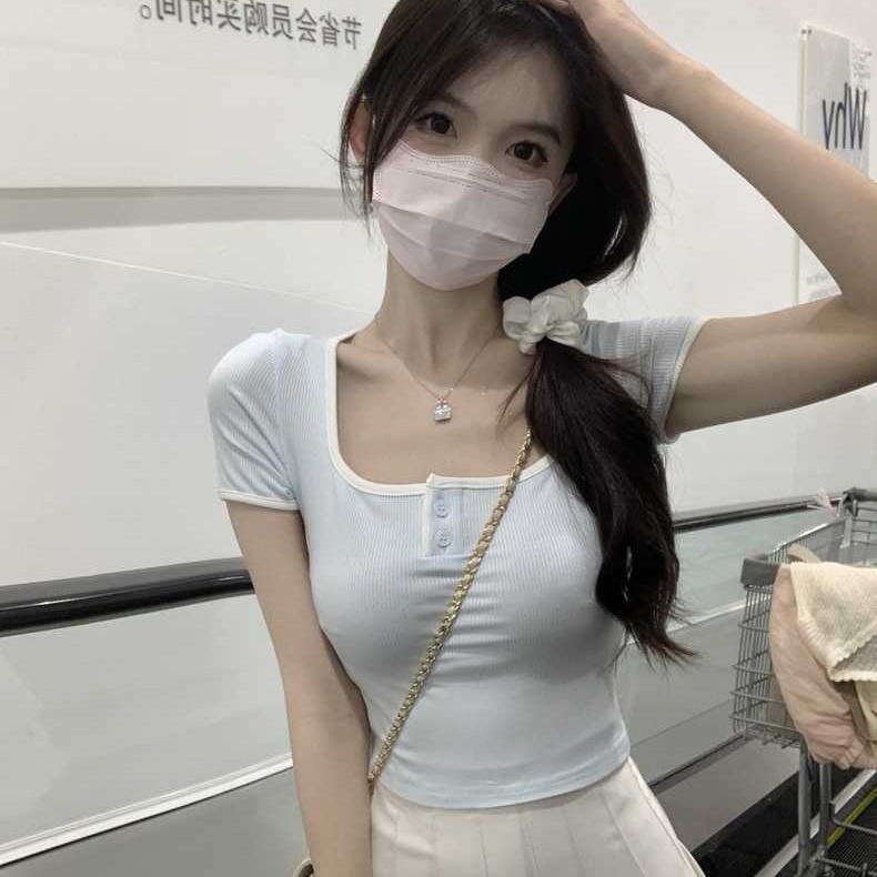 方领修身撞色短袖T恤女夏季新款设计感小众法式甜辣短款上衣