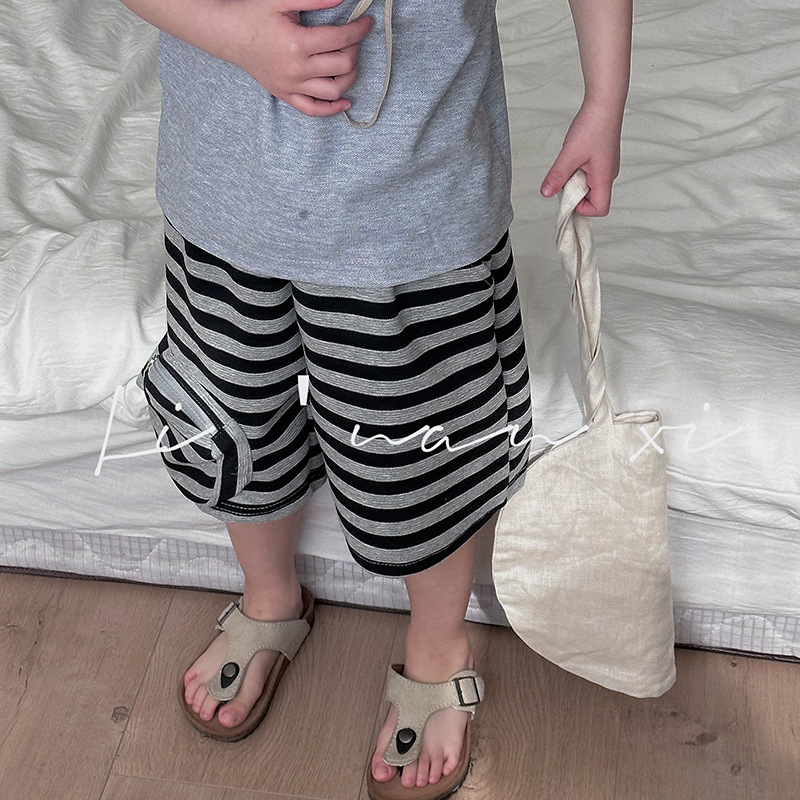 24夏新款儿童短裤男女童针织条纹休闲中裤重工口袋户外外出五分裤