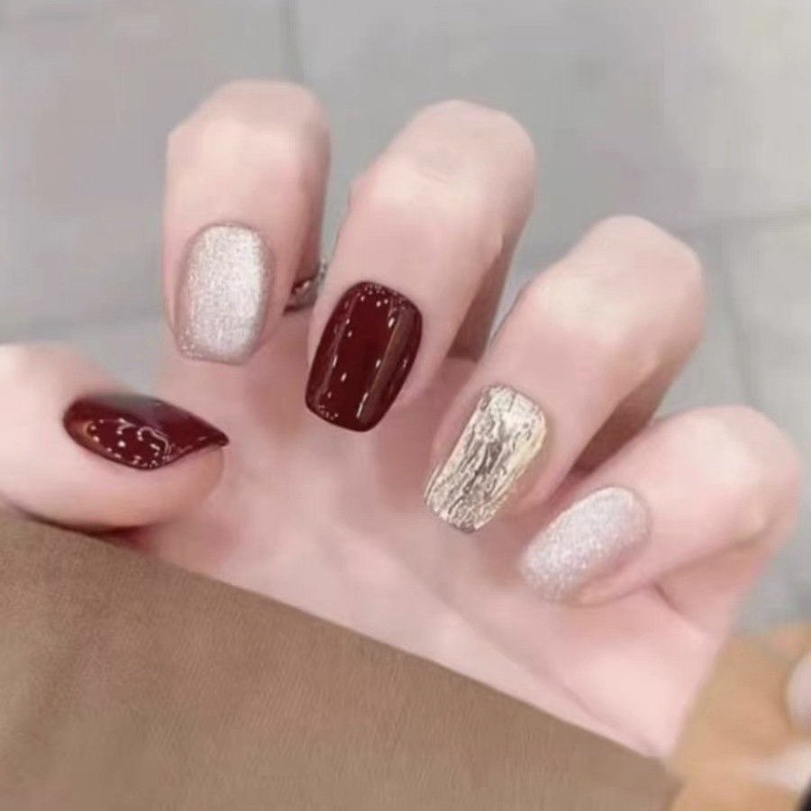 港风美人纯手工穿戴甲秋冬款气质轻奢车厘子红显白鎏金猫眼新娘甲