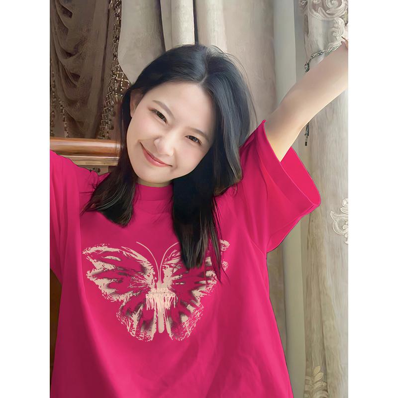 oversize小众圆领短袖T恤女夏季新款火龙果色半袖上衣