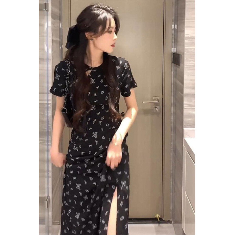 夏季新款改良旗袍裙子新中式国风盘扣漏背黑色雪纺碎花连衣裙