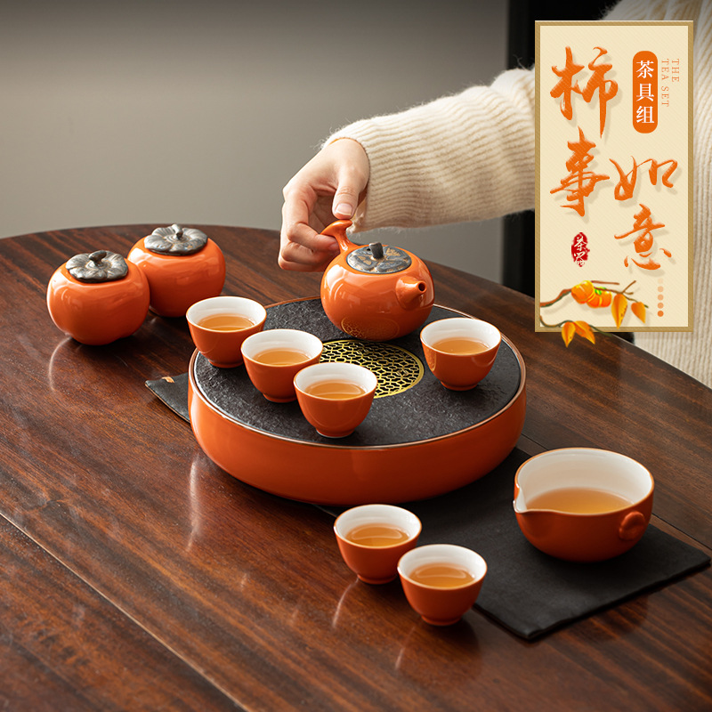 柿子茶具套装 柿事如意轻奢高档功夫泡茶小型茶盘茶壶茶杯礼盒装