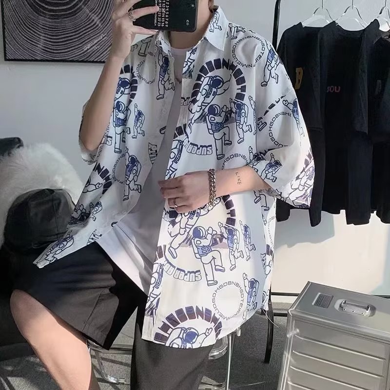 夏季新款冰丝短袖衬衫男港风潮牌宽松薄款衬衣痞帅设计感男士外套